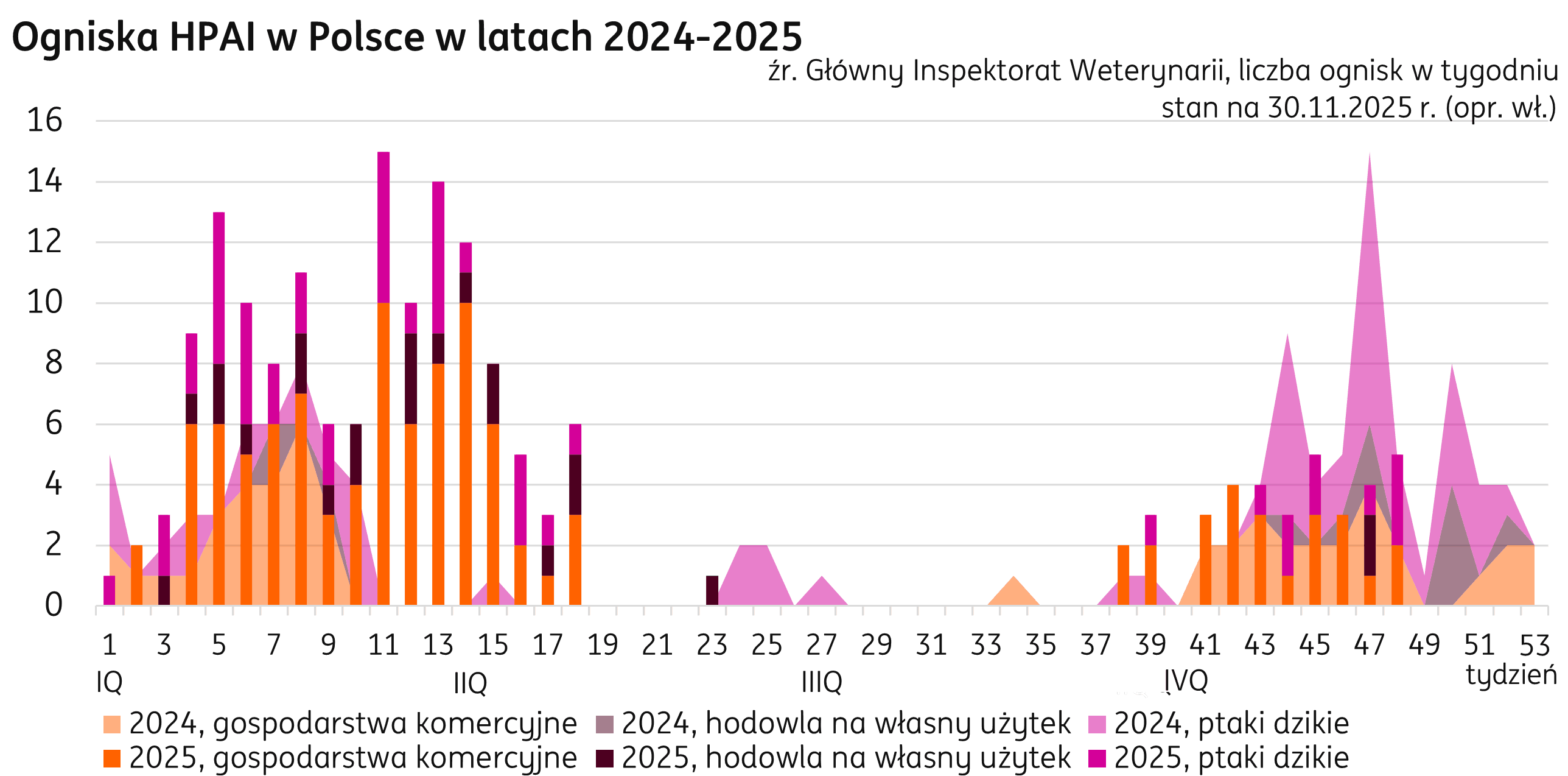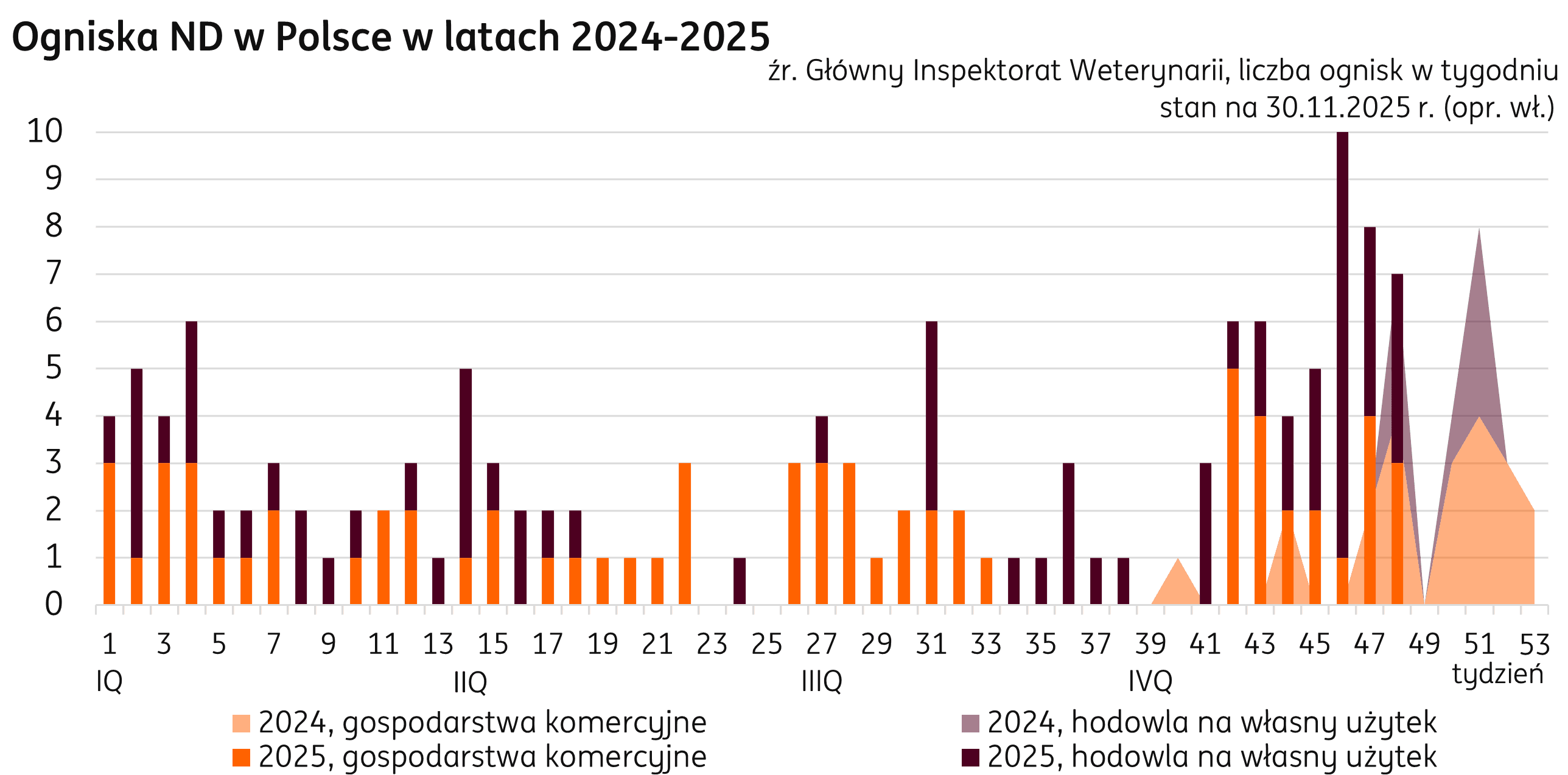 W listopadzie 2025 r. wystąpiło 9 ognisk grypy ptaków w hodowlach komercyjnych. To o dwa ogniska mniej niż w ubiegłym miesiącu i spadek o jedno ognisko w porównaniu z listopadem 2024 r. W tym miesiącu potwierdzono również 10 ognisk rzekomego pomoru drobiu, to o jedno ognisko mniej w porównaniu do października, natomiast wzrost o cztery w zestawieniu z listopadem ubiegłego roku.
