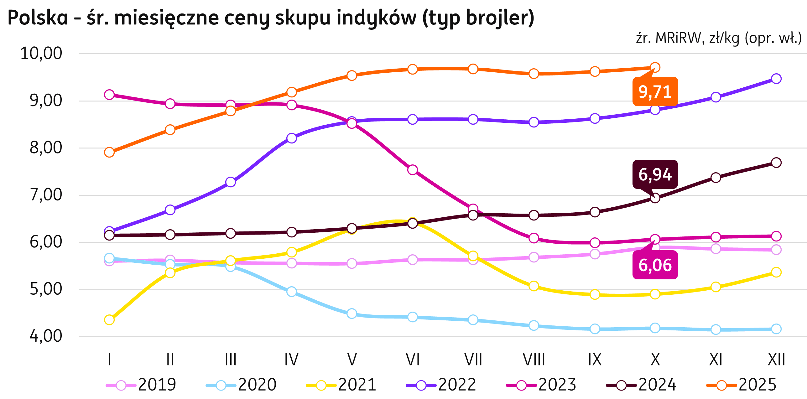 Październikowa średnia miesięczna cena skupu brojlerów indyków w Polsce (publikacja MRiRW) kształtowała się na poziomie 9,71 zł/t, o 0,9% powyżej notowań ubiegłomiesięcznych (+8 gr/kg). Cena skupu indyków utrzymuje się na poziomie o 40% wyższym niż w październiku 2024 r. (-2,77 zł/kg). Cena w tygodniu kończącym się 23 listopada 2025 r. to 9,66 zł/kg (-0,2% m/m).