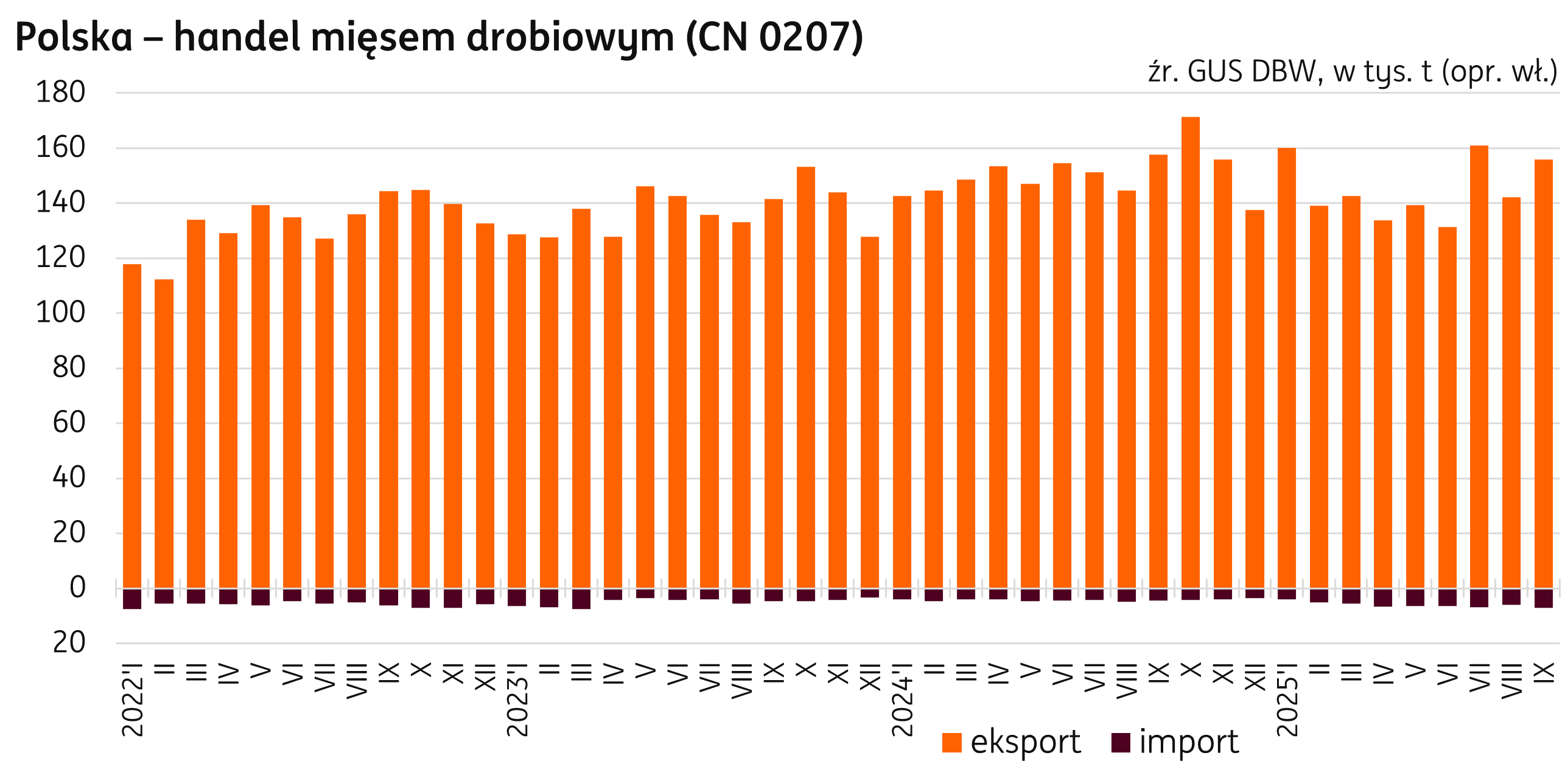 Handel. Po trzech kwartałach 2025 r. eksport mięsa drobiowego w wadze produktu (CN 0207) kształtuje się na poziomie 1 305 tys. t, o 3% poniżej wyniku sprzed roku (-39 tys. t; dane GUS Dziedzinowe Bazy Wiedzy). Tylko we wrześniu eksport był niższy w ujęciu rocznym o 1%, osiągając 156 tys. t (-2 tys. t r/r). Import tego rodzaju produktów w okresie I-IX 2025 r. osiągnął 54 tys. t, rosnąc o 37% w relacji do analogicznego okresu ubiegłego roku (+15 tys. t r/r), a wolumen ten stanowi 4% eksportu w analizowanym okresie.
