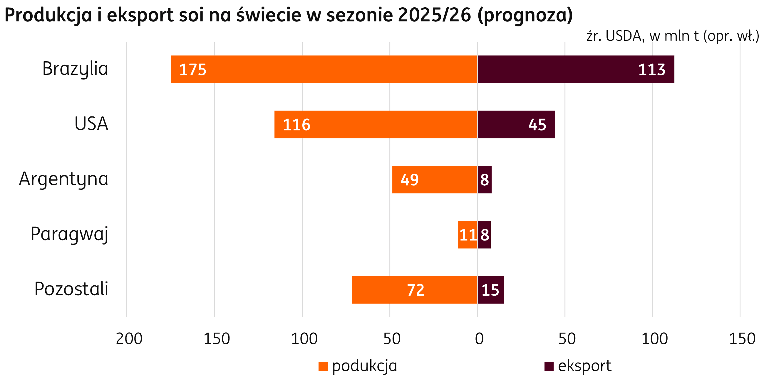 Produkcja soi na świecie. Globalna produkcja soi w sezonie 2025/26 została przez Departament Rolnictwa Stanów Zjednoczonych w raporcie WASDE skorygowana do 422 mln t, co oznacza spadek o 5 mln t w porównaniu do zbiorów uzyskanych w ubiegłym sezonie. Największymi eksporterami pozostają Brazylia (175 mln t, +4 mln t r/r) oraz USA (116 mln t, -3 mln t r/r) – produkujący 69% soi w bieżącym sezonie. Najwięcej soi mają zaimportować Chiny - 112 mln t (+4 mln t r/r), a kolejne są kraje UE z wolumenem 14 mln t (-0,3 mln t r/r).