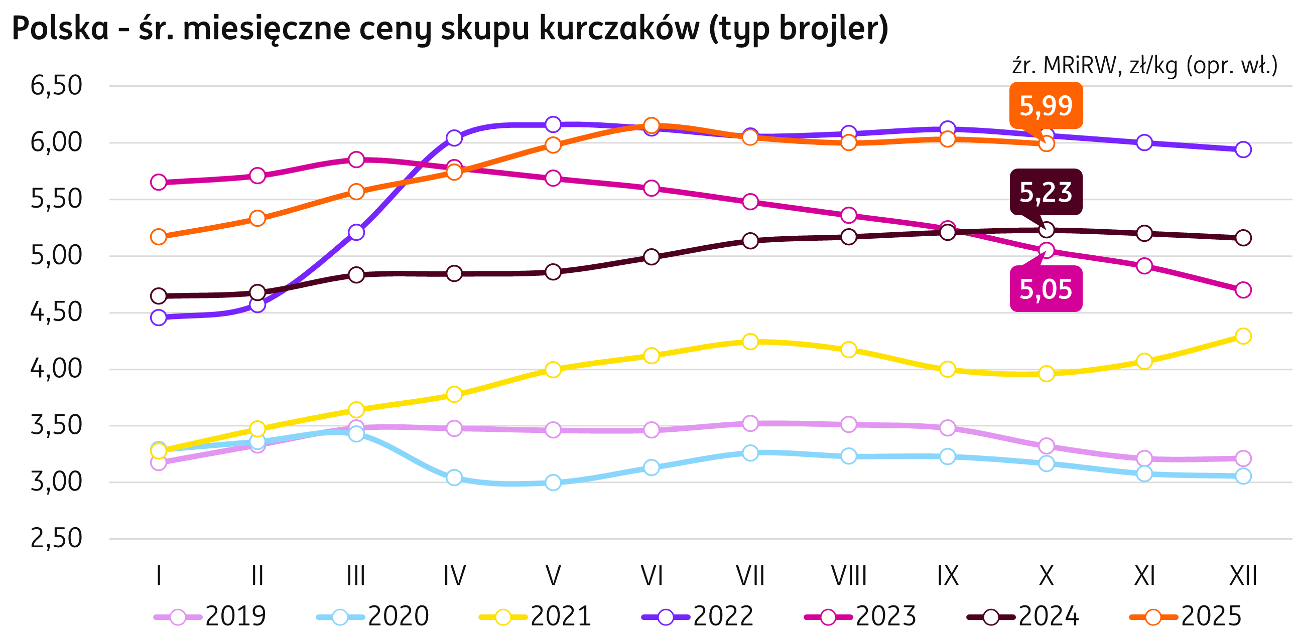 Ceny. W październiku 2025 r. cena skupu brojlerów kurcząt spadła w Polsce do 5,99 zł/kg (Dane wg Biuletynu MRiRW), to o 4 gr/kg mniej niż w ubiegłym miesiącu (-0,7% m/m), ale wciąż cena utrzymuje się o 15% powyżej ubiegłorocznej (+76 gr/kg r/r). W tygodniu kończącym się 23 listopada 2025 r. cena skupu kurcząt to 5,51 zł/kg (-8% m/m).