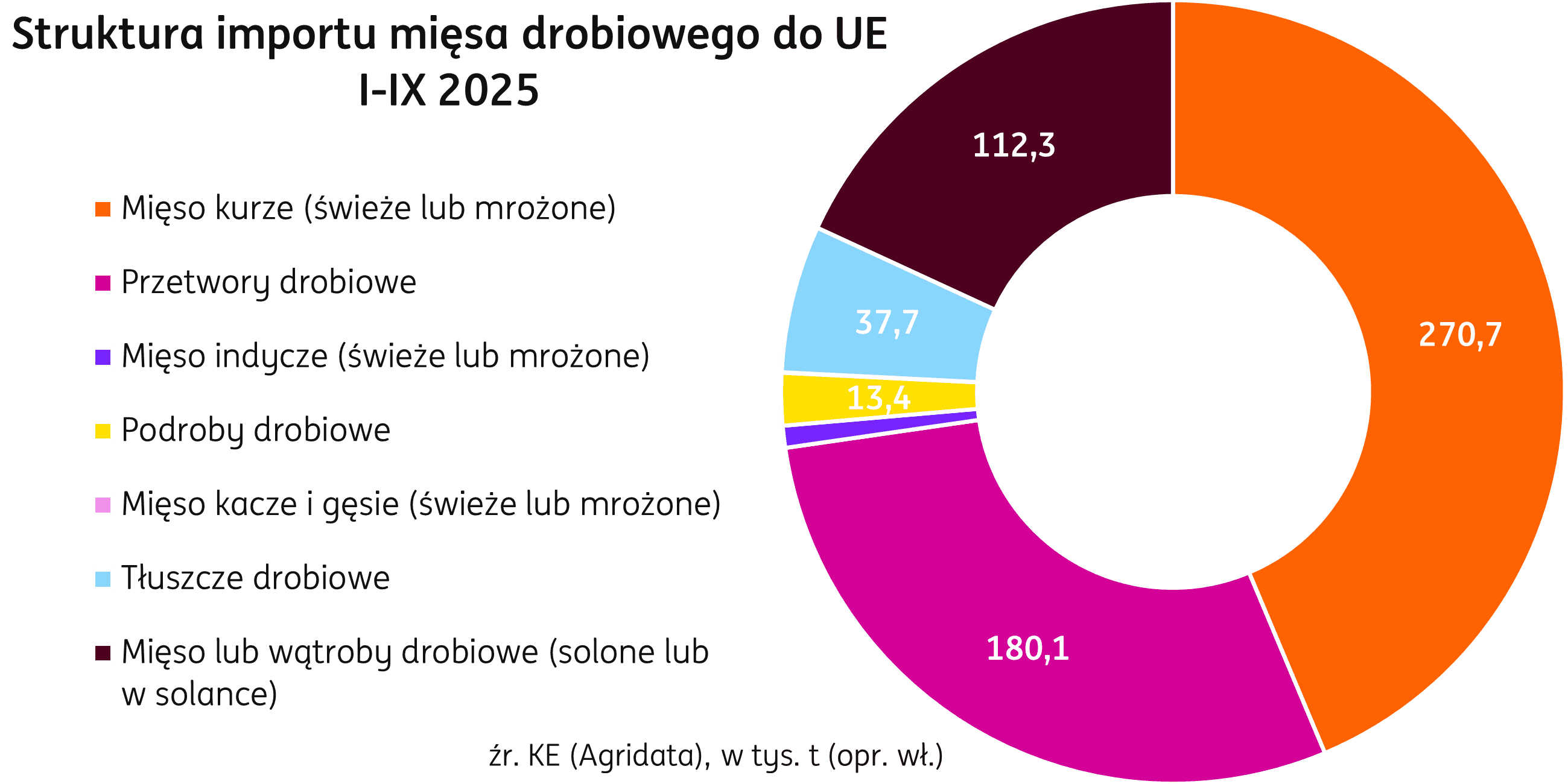Kraje członkowskie w ciągu dziewięciu miesięcy 2025 r. zaimportowały spoza UE 623 tys. t, o 4% powyżej poziomu ubiegłorocznego (dane z portalu Agridata). Import z Brazylii osiągnął wolumen 155 tys. t, to o 2% poniżej wyniku z analogicznego okresu ubiegłego roku. Kolejnymi znaczącymi eksporterami drobiu do UE są Wielka Brytania (148 tys. t, +2% r/r), Tajlandia (125 tys. t, +17% r/r) oraz Ukraina (119 tys. t, -9% r/r). Cztery wymienione powyżej kraje odpowiadają za 88% importowanego drobiu w analizowanym okresie. 57% importu trafia do Holandii, od początku roku to już 356 tys. t (+5% r/r).