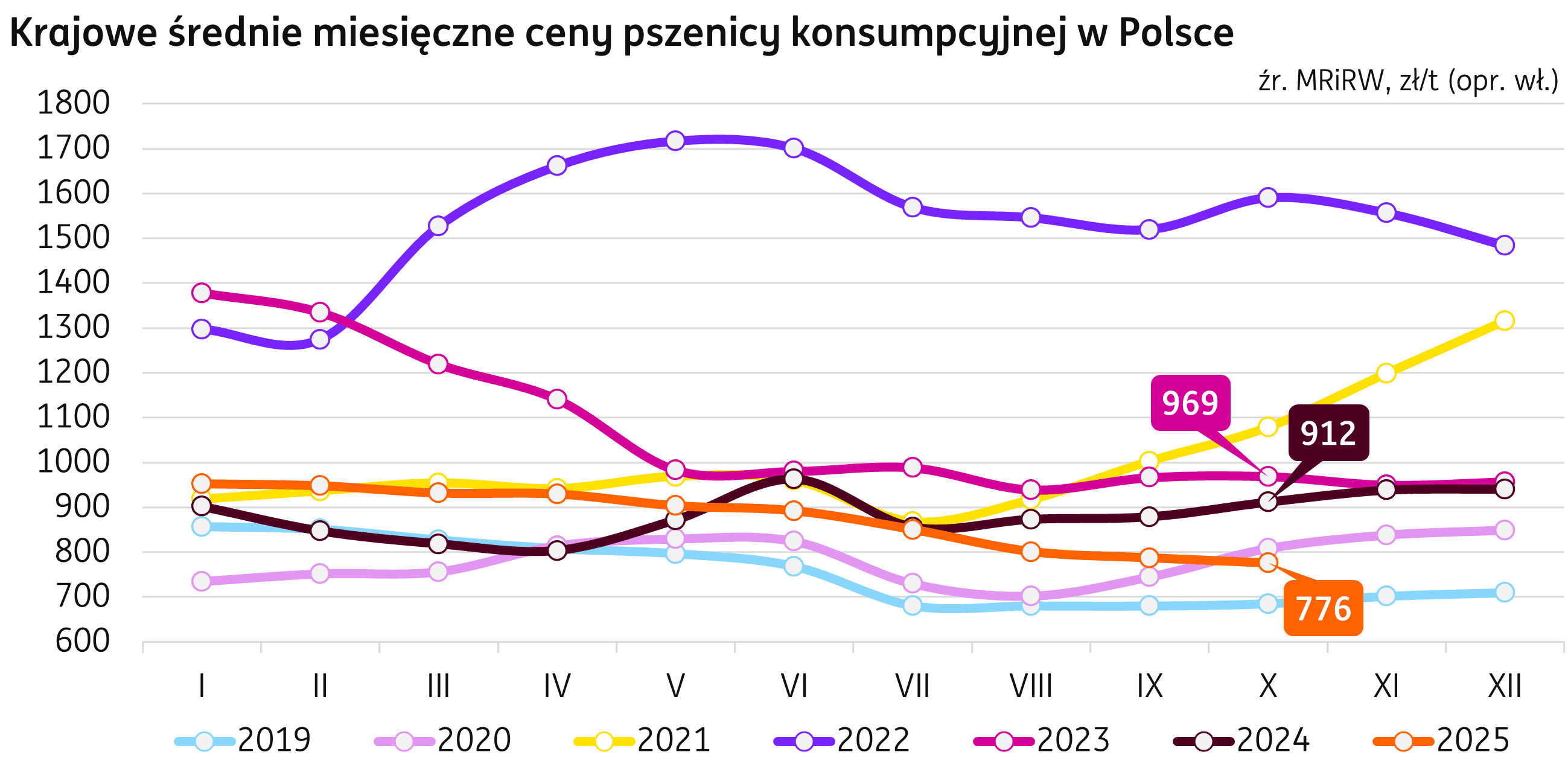 Cena. Średnia miesięczna cena pszenicy konsumpcyjnej w Polsce, według Biuletynu MRIRW, spadła w październiku do 776 zł/t, o 1% m/m, a w porównaniu rocznym kształtuje się o 15% poniżej poziomu z października 2025 r. W tygodniu kończącym się 23 listopada 2025 r. średnie ceny pszenicy konsumpcyjnej na rynku krajowym kształtowały się w przedziale 678-825 zł/t.
