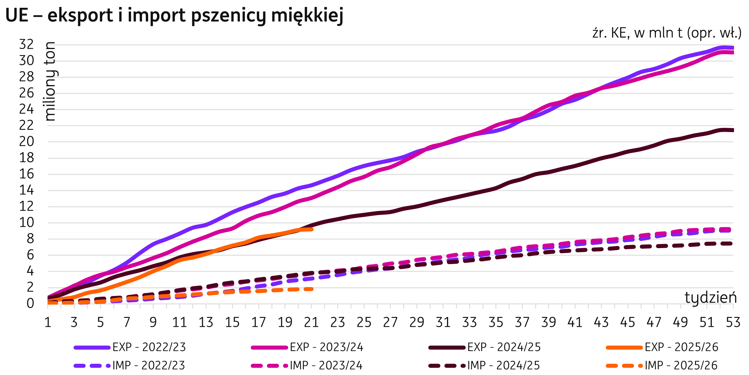 Unia Europejska. Po upływie 21 tygodni sezonu 2025/26 (okres 01.07.2025-21.11.2025), eksport pszenicy z krajów UE, zgodnie ze wstępnymi danymi opublikowanymi przez KE, osiągnął poziom 9,2 mln t, to spadek o 0,5 mln t w porównaniu do analogicznego okresu poprzedniego sezonu (-5% r/r). Największym odbiorcą pszenicy z UE było Maroko z wolumenem 1,7 mln t (+0,9 mln t r/r), a kolejnym Arabia Saudyjska importująca 0,7 mln t (+0,2 mln t r/r). Import w analizowanym okresie był na poziomie 1,8 mln t, o 2,0 mln t (-52% r/r) niższy w relacji rocznej. 39% importowanej w tym okresie pszenicy pochodziło z Kanady (715 tys. t), a 23% z Ukrainy (421 tys. t).