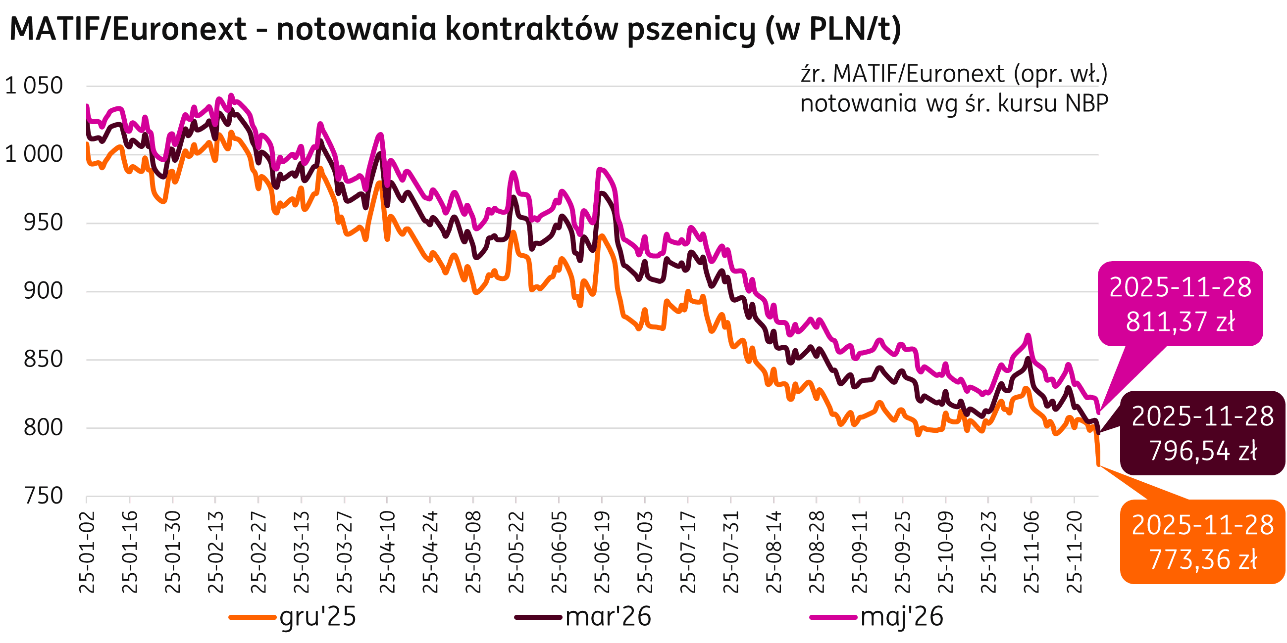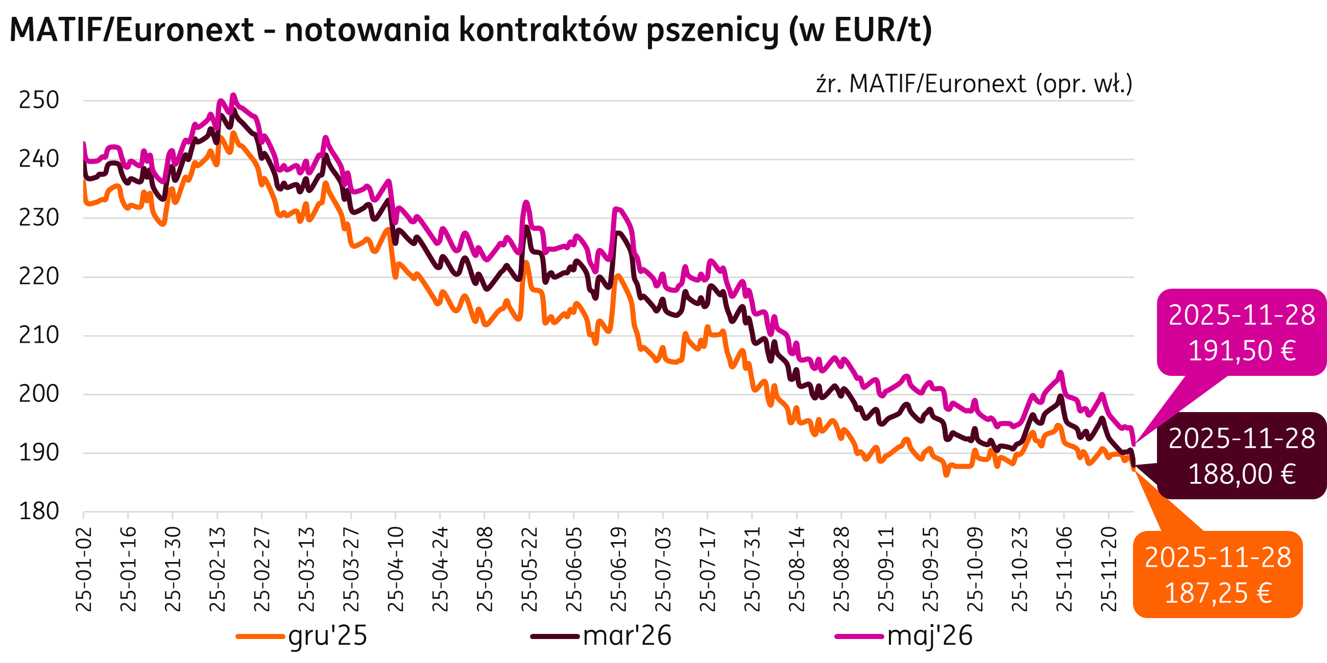 Listopad 2025 r. kończył się notowaniami grudniowego kontraktu pszenicy na giełdzie Euronext/MATIF na poziomie 187,25 EUR/t, co oznacza spadek o 5,00 EUR/t w porównaniu do notowań z października (-2,6% m/m). Kontrakt marcowy był 28 listopada 2025 r. notowany na poziomie 188,00 EUR/t (-4,0% m/m), natomiast majowy na poziomie 191,50 EUR/t (-3,9% m/m).