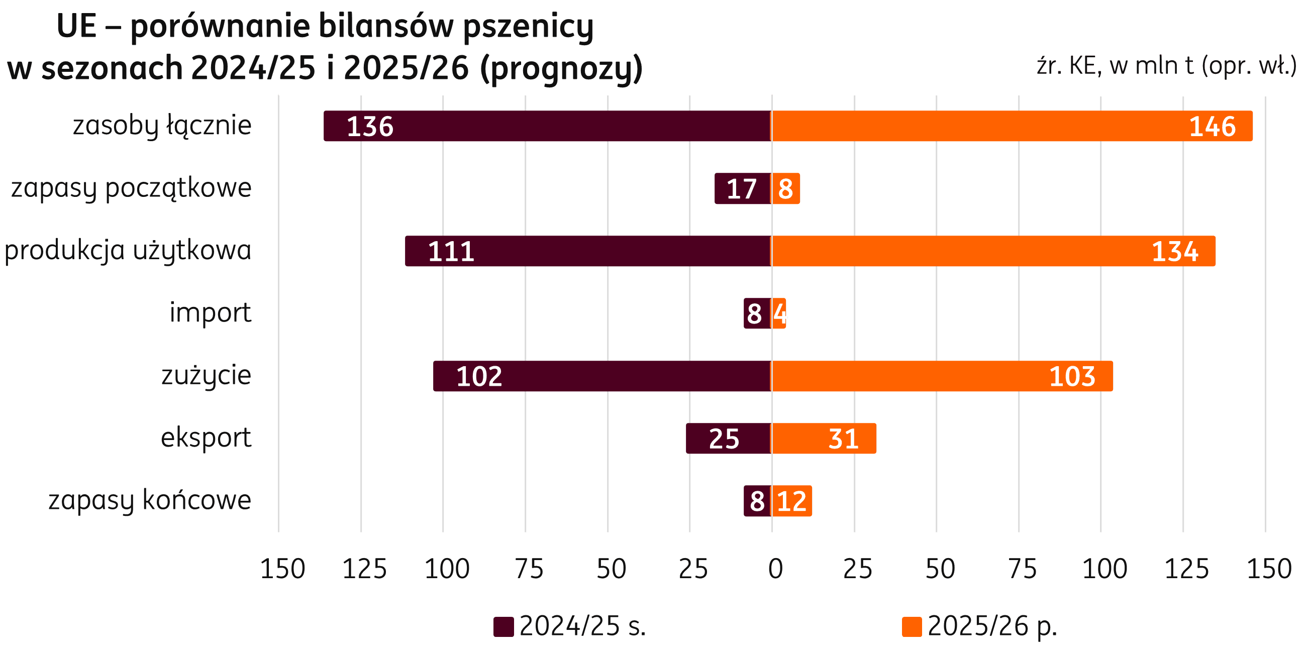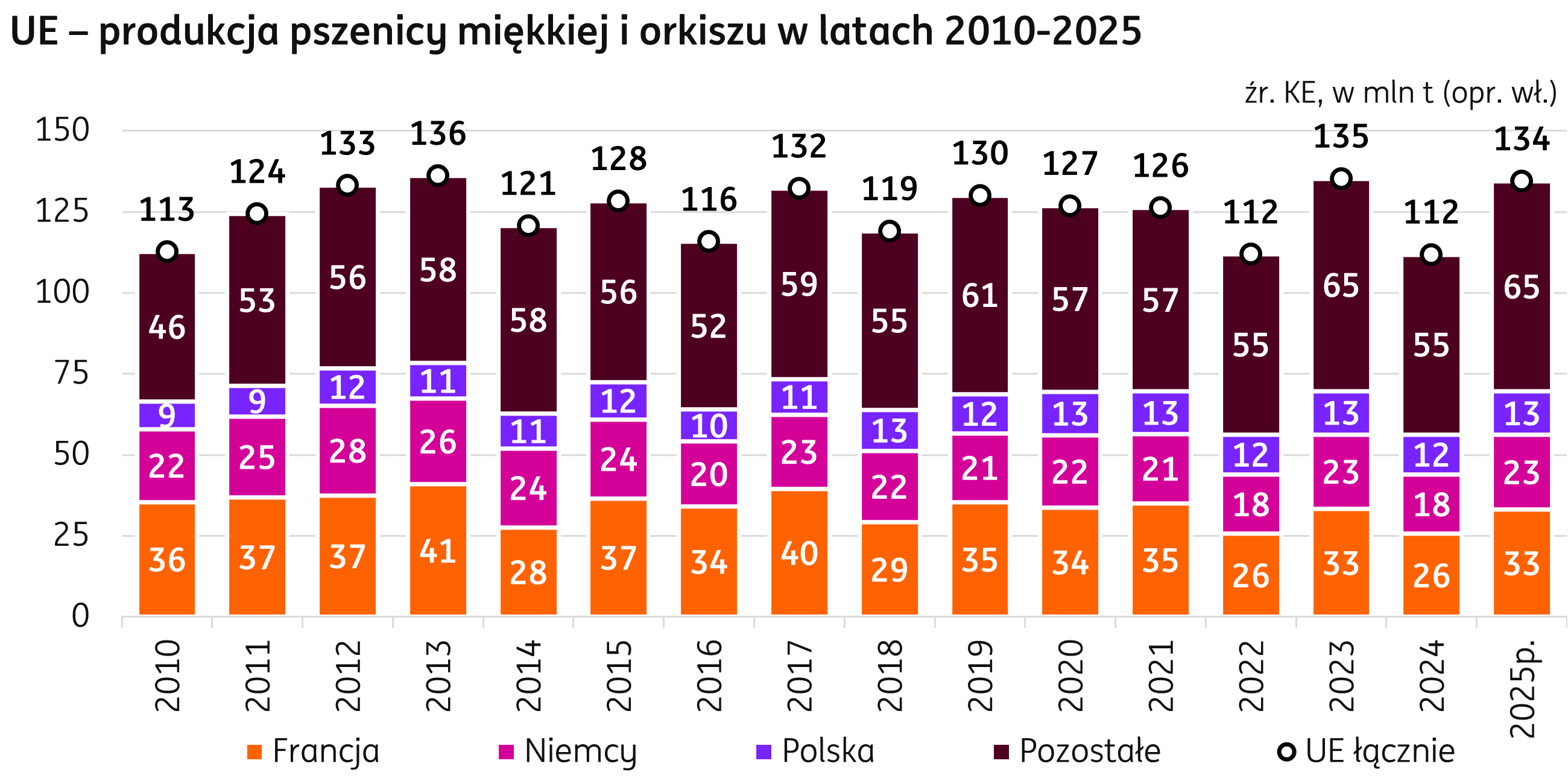 Unia Europejska. W listopadzie 2025 r. zbiory pszenicy w UE zostały zaktualizowane przez Komisję Europejską do 134 mln t, to o 23 mln t powyżej produkcji notowanej w ubiegłym roku (+20% r/r). Zbiory pszenicy u największych producentów są szacowane na następujących poziomach: we Francji 33 mln t (+29% r/r), w Niemczech 23 mln t (+26% r/r), natomiast w Polsce 13 mln t (+8% r/r).