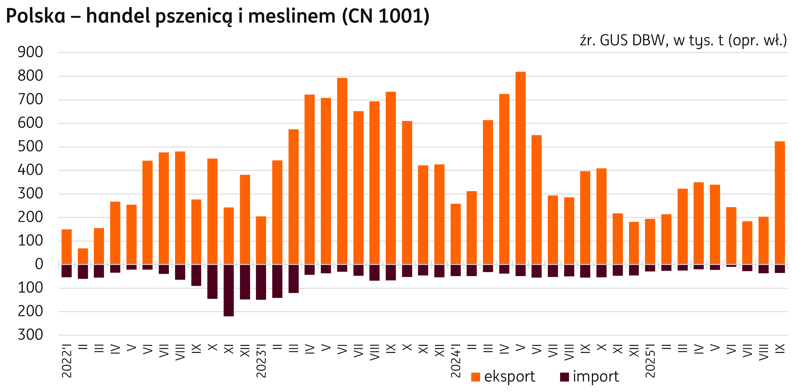 Handel. Po trzech miesiącach sezonu 2025/26 eksport pszenicy z Polski jest na poziomie 911 tys. t, o 7% poniżej wyniku notowanego w analogicznym okresie ubiegłego sezonu (-66 tys. t r/r). We wrześniu wyeksportowano 523 tys. t tego zboża, to wzrost o 32% w zestawieniu z wrześniem 2024 r. (+126 tys. t r/r). Import spadł do 101 tys. t, o 36% poniżej poziomu ubiegłorocznego, a tylko we wrześniu osiągnął 36 tys. t, o 36% mniej niż przed rokiem.