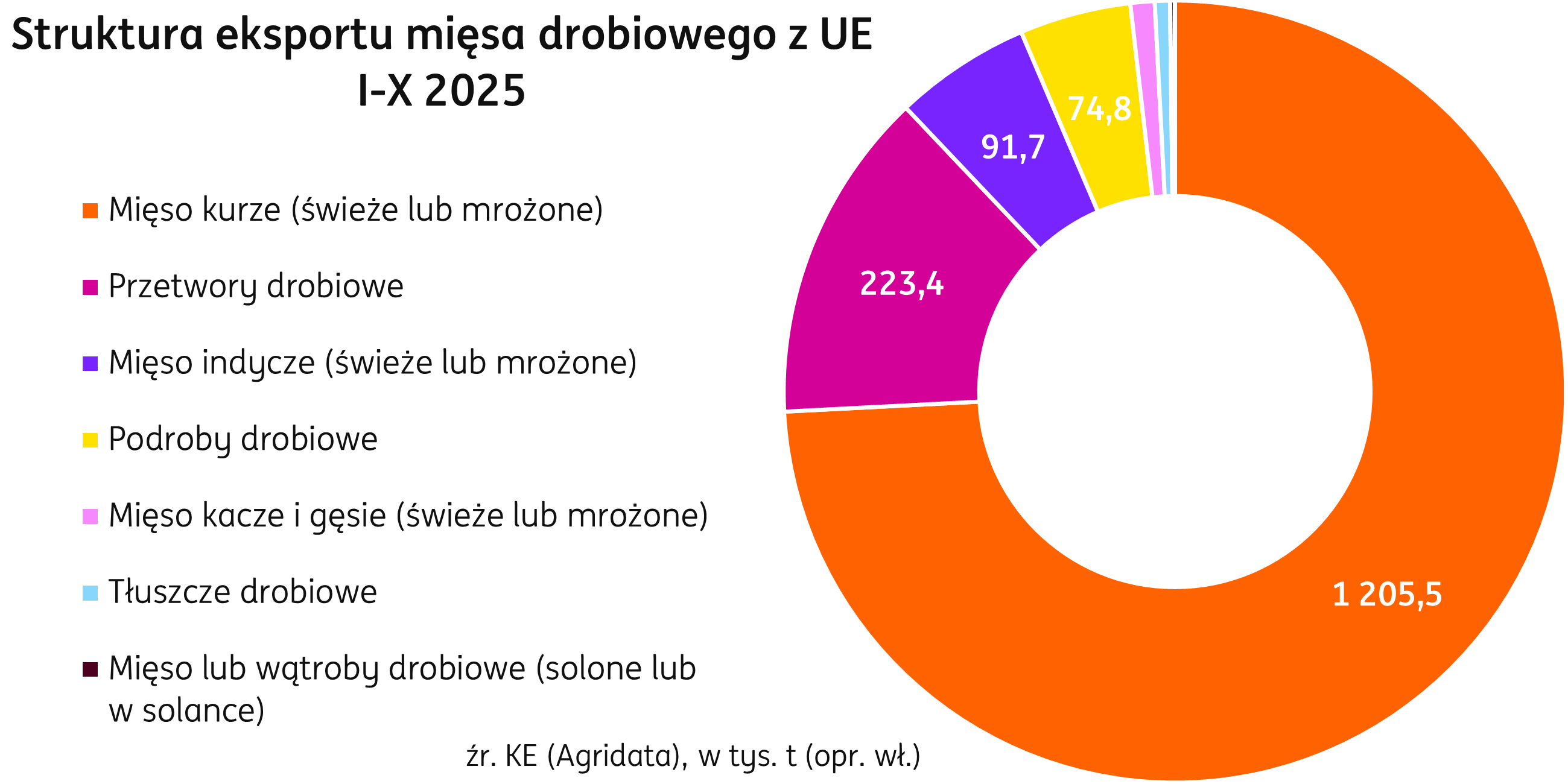 Unia Europejska. W ciągu dziesięciu miesięcy 2025 r. eksport mięsa drobiowego poza granice UE ukształtował się na poziomie 1 637 tys. t, o 2% poniżej poziomu ubiegłorocznego (dane zgodnie z portalem Agridata). Notująca wcześniej spory spadek najpopularniejsza kategoria eksportowa, czyli mięso kurze (świeże lub mrożone), po październiku jest już nieznacznie powyżej poziomu notowanego w ubiegłym roku (+0,5 tys. t r/r), natomiast wolumenowo najbardziej spadł eksport podrobów drobiowych (-23% r/r). Największym eksporterem poza UE jest Polska posiadająca 35% udziału w unijnym eksporcie. Wolumen dostaw z Poslki spadł w okresie I-X do 570 tys. t, o 10% poniżej wyniku ubiegłorocznego (-65 tys. t r/r). Kolejna, Holandia, dostarczyła poza UE 373 tys. t (23% eksportu drobiu z UE w tym okresie), o 6% więcej w relacji rocznej. Ostatnia na podium jest Belgia z eksportem 119 tys. t (+5% r/r) i udziałem siedmioprocentowym. Największym importerem drobiu z UE była w tym okresie Wielka Brytania, importująca 569 tys. t (-1% r/r), kolejne są Ghana (138 tys. t, +14% r/r) i Kongo (109 tys. t, +23% r/r).