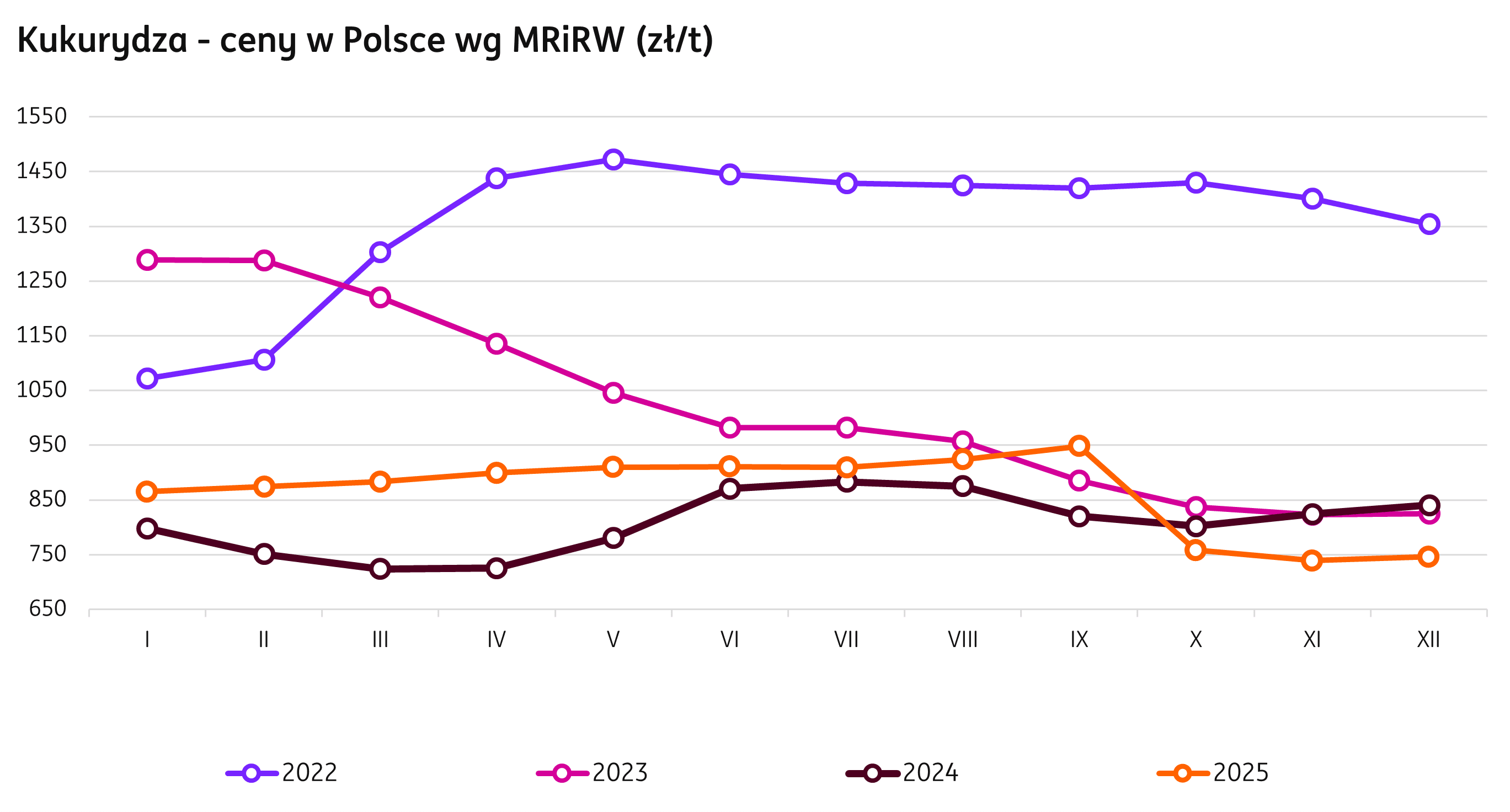 Według danych MRiRW w tygodniu kończącym się 4 stycznia 2026 r. cena tony suchej kukurydzy paszowej wyniosła 744 zł. W porównaniu z analogicznym okresem 2024 r. stawka jest niższa o 12% (-103 zł). Z kolei w stosunku do końca grudnia 2023 r. aktualna cena jest niższa o 74 zł (-9%). Ceny za mokre ziarno kształtują się ok. 414 zł (wobec 435 zł przed miesiącem).