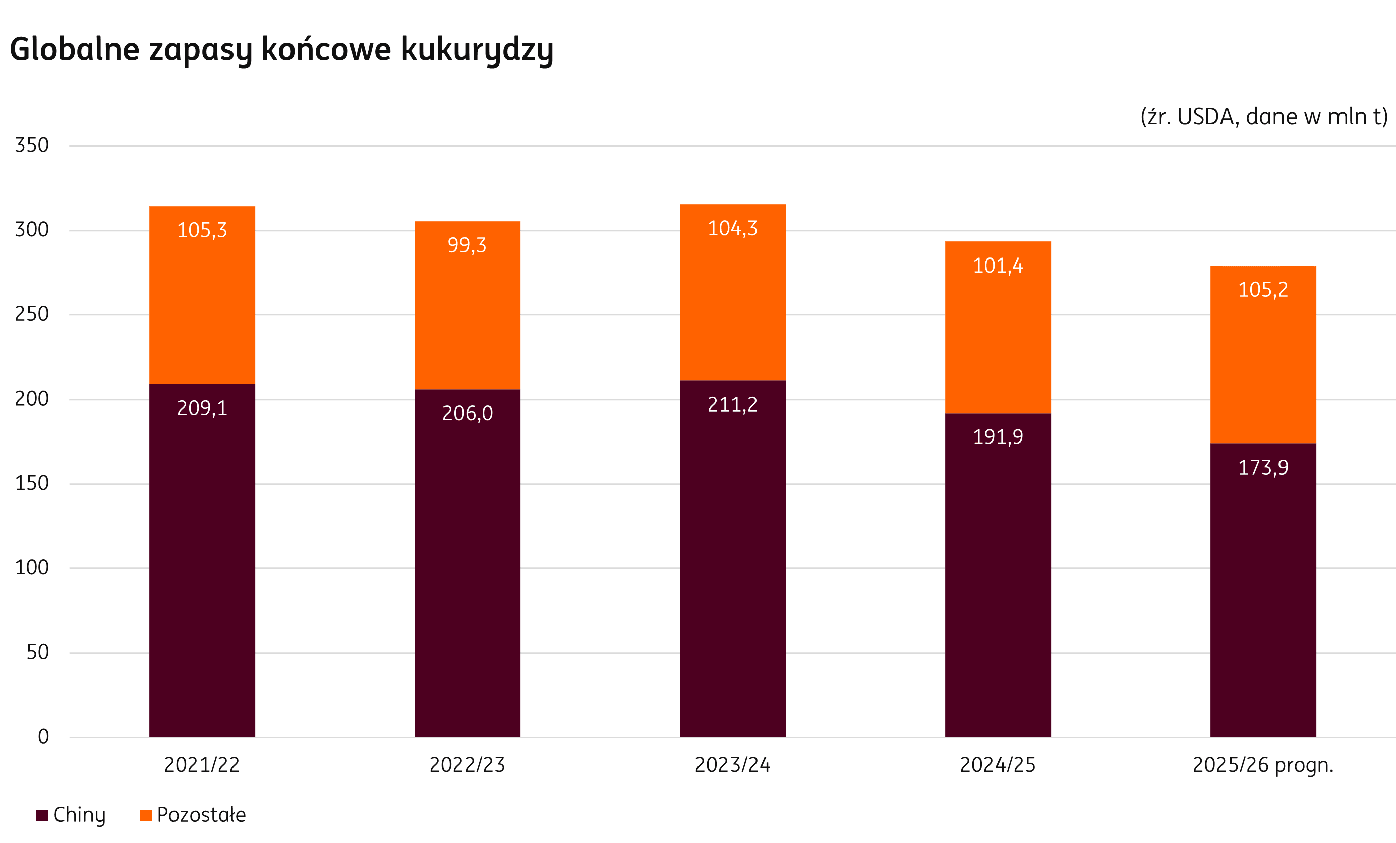 Wolumen zapasów spada kolejny miesiąc z rzędu. W sezonie 2025/26 ich wartość określana jest na nieznacznie ponad 279 mln t. To prawie 1% mniej niż we wcześniejszej prognozie. Z kolei w stosunku do sezonu 2024/25 wolumen jest o niemal 5% niższy.
