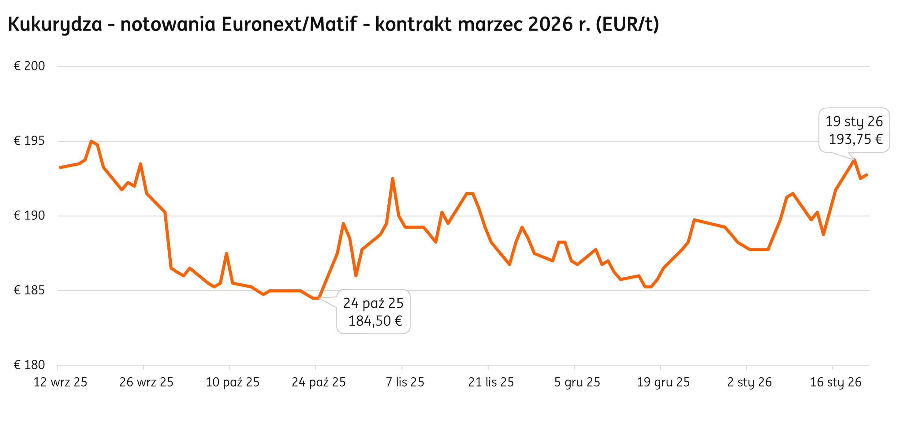 Od połowy listopada do połowy grudnia notowania traciły, chociaż kurs były bardzo zmienne. Zmiana trendu nastąpiła pod koniec roku, kiedy z pułapu 186 EUR kontrakt marcowy umacniał się osiagając w drugiej części stycznia poziom 194 EUR. To najwięcej od 1 sierpnia 2025 r.