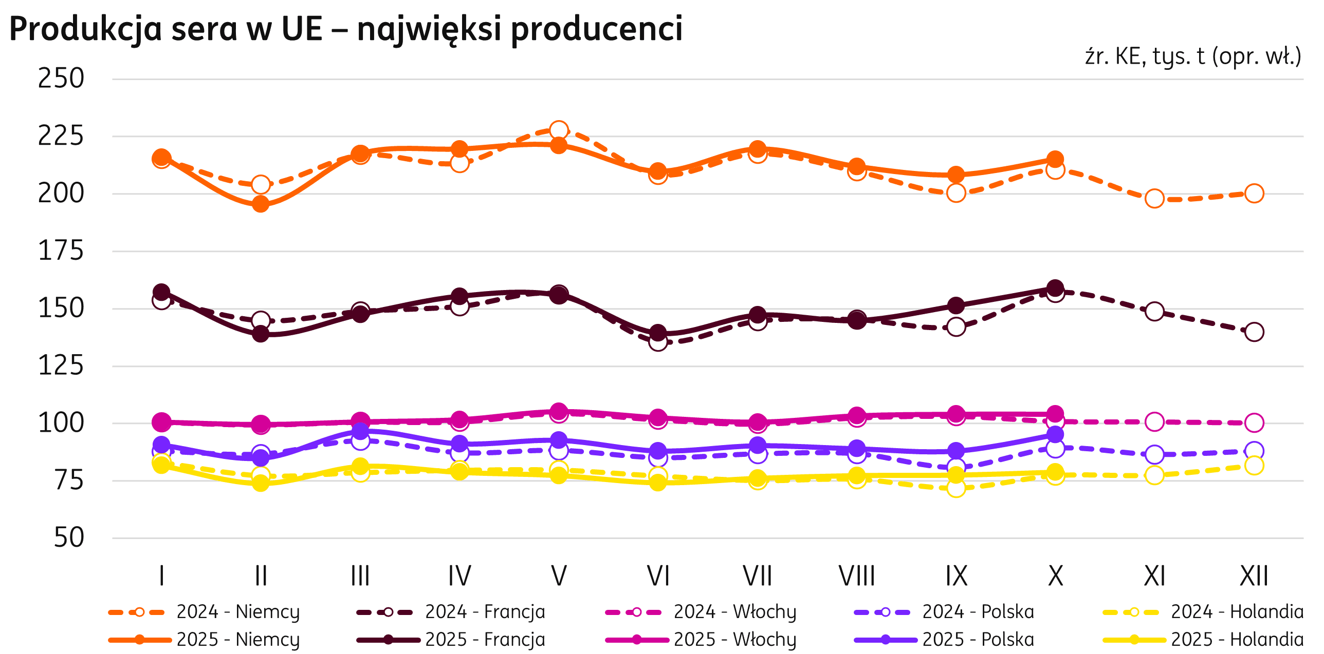 Po dziesięciu miesiącach 2025 r. produkcja sera utrzymuje wzrost o 2% ponad wyniki ubiegłoroczne i notuje wolumen 8,2 mln t (+137 tys. t r/r; zgodnie z publikacją KE). W ujęciu wolumenowym liderem wzrostu jest Polska, produkcja w naszym kraju podniosła się o 36 tys. t r/r (+4% r/r), a następna w tej kategorii jest Francja (+17 tys. t, +1% r/r).