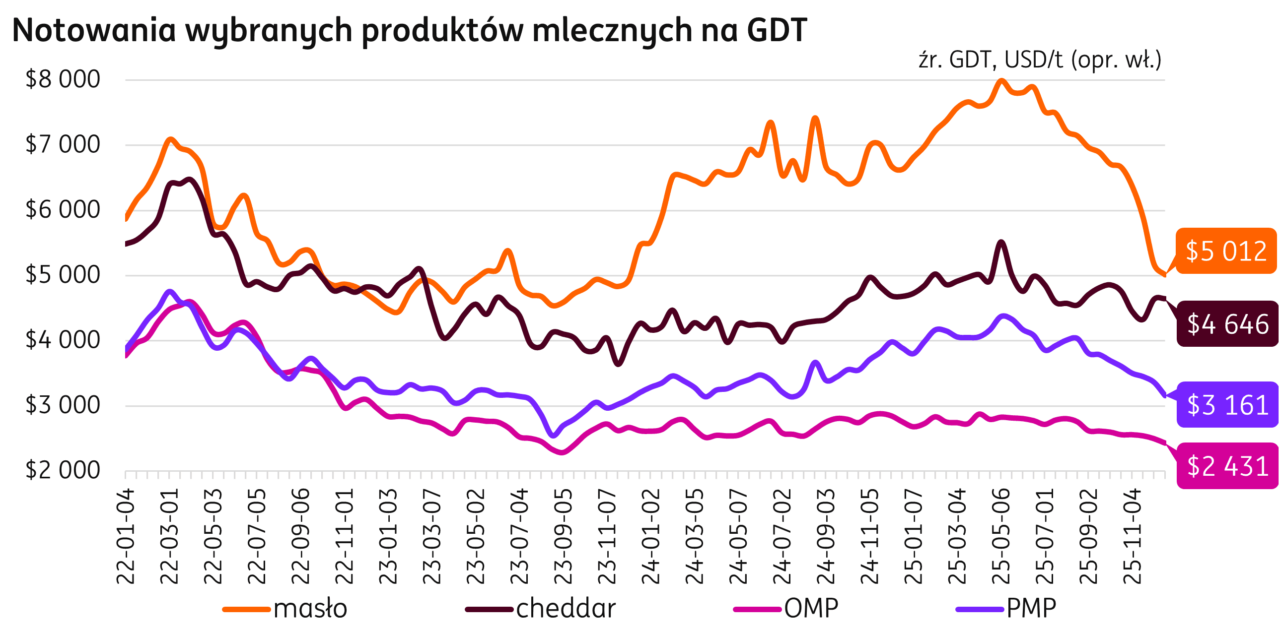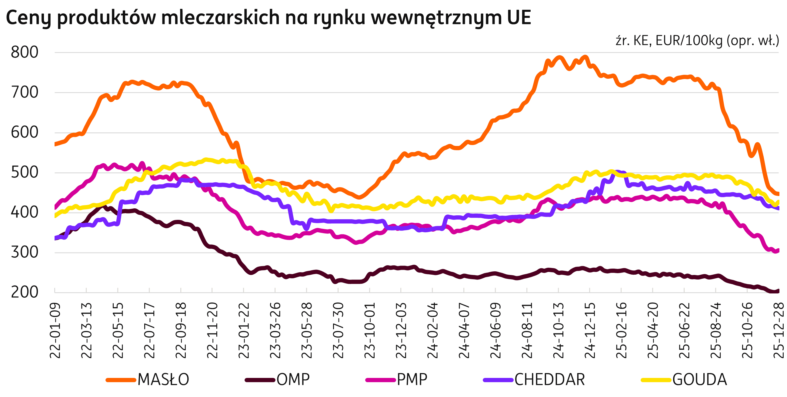 28 grudnia 2025 r. na rynku wewnętrznym UE ceny produktów mleczarskich kształtowały się na poziomach (dane wg publikacji KE): masło 447 EUR/100 kg (-11% m/m; -41% r/r), OMP 204 EUR/100 kg (-3% m/m; -21% r/r), PMP 306 EUR/100 kg (-4% m/m; -30% r/r), ser cheddar 411 EUR/100 kg (-3% m/m; -11% r/r), ser gouda 427 EUR/100 kg (-4% m/m; -15% r/r), serwatka w proszku 107 EUR/100 kg (+2% m/m; +10% r/r).