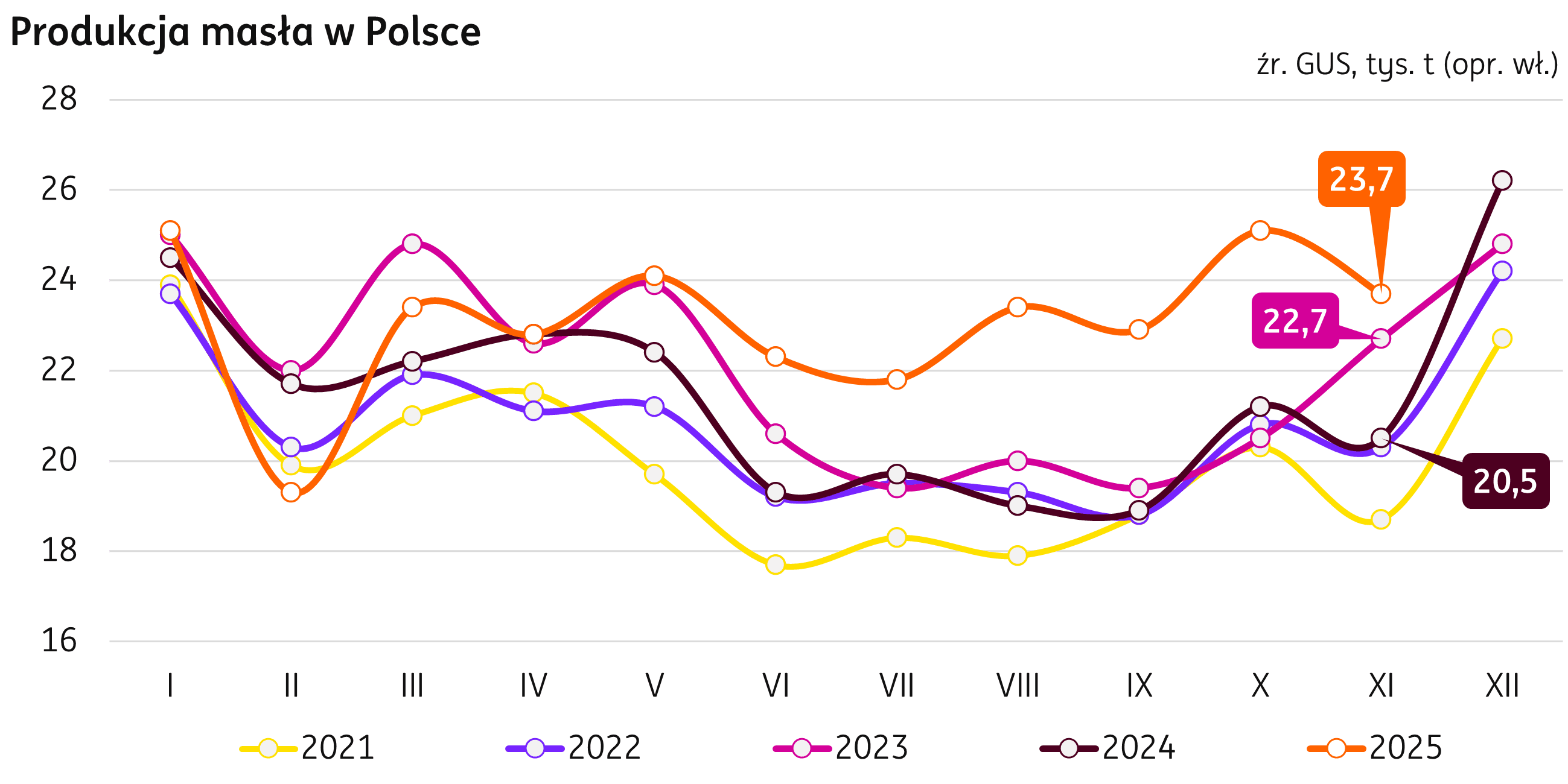 Produkcja masła. W listopadzie produkcja masła notuje wzrost o kolejne 3 tys. t w porównaniu rocznym i kształtuje się na poziomie 34 tys. t (+16% r/r, dane zgodnie z Biuletynem Statystycznym GUS). Narastająco od początku roku produkcja masła wyniosła 254 mln t, o 9% powyżej poziomu ubiegłorocznego (+22 tys. t r/r).