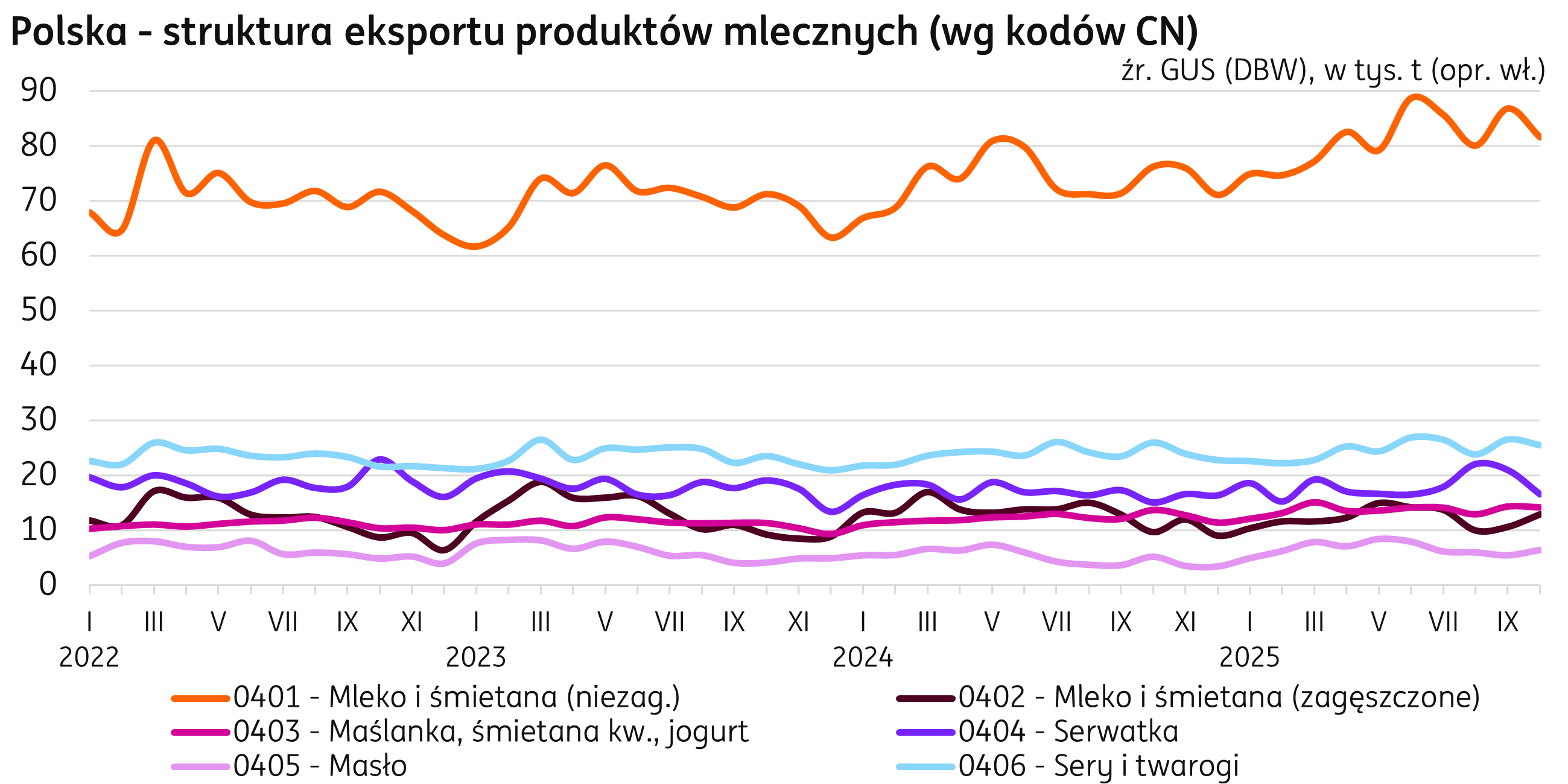 Handel. Po dziesięciu miesiącach 2025 r. wartość eksportu produktów mleczarskich z Polski notuje wzrost do 12,7 mld PLN, o 12% powyżej wyniku ubiegłorocznego z analogicznego okresu (dane wg Biuletynu MRiRW ZSRIR). W analizowanym okresie utrzymuje się wzrost eksportu niemal wszystkich badanych kategorii nabiału, zarówno wartościowo, jak i ilościowo. Wyróżnia się masło (CN 0405) – wartość jego dostaw podniosła się o 39% r/r przy wolumenie wyższym o 22% r/r. Pozostałe kategorie eksportowe utrzymują wzrost wartości w przedziale 10%-18% w ujęciu rocznym. Wyjątek wśród analizowanych kategorii stanowi mleko i śmietana zagęszczone (CN 0402), jej eksport zanotował spadek w okresie I-X 2025 r. wartościowo o 14%, przy wolumenowym spadku o 10%. Import w I-X 2025 r. osiągnął wartość 6,1 mld PLN, rosnąc o 5% w relacji rocznej. Wartościowo największy wzrost odnotowano dla importu sera i twarogów (CN 0406) – o 16% r/r, przy wolumenowym spadku o 3% r/r, wartościowo zwiększył się również import serwatki (CN 0404) o 14% przy równoczesnym spadku wolumenu o 8% r/r.