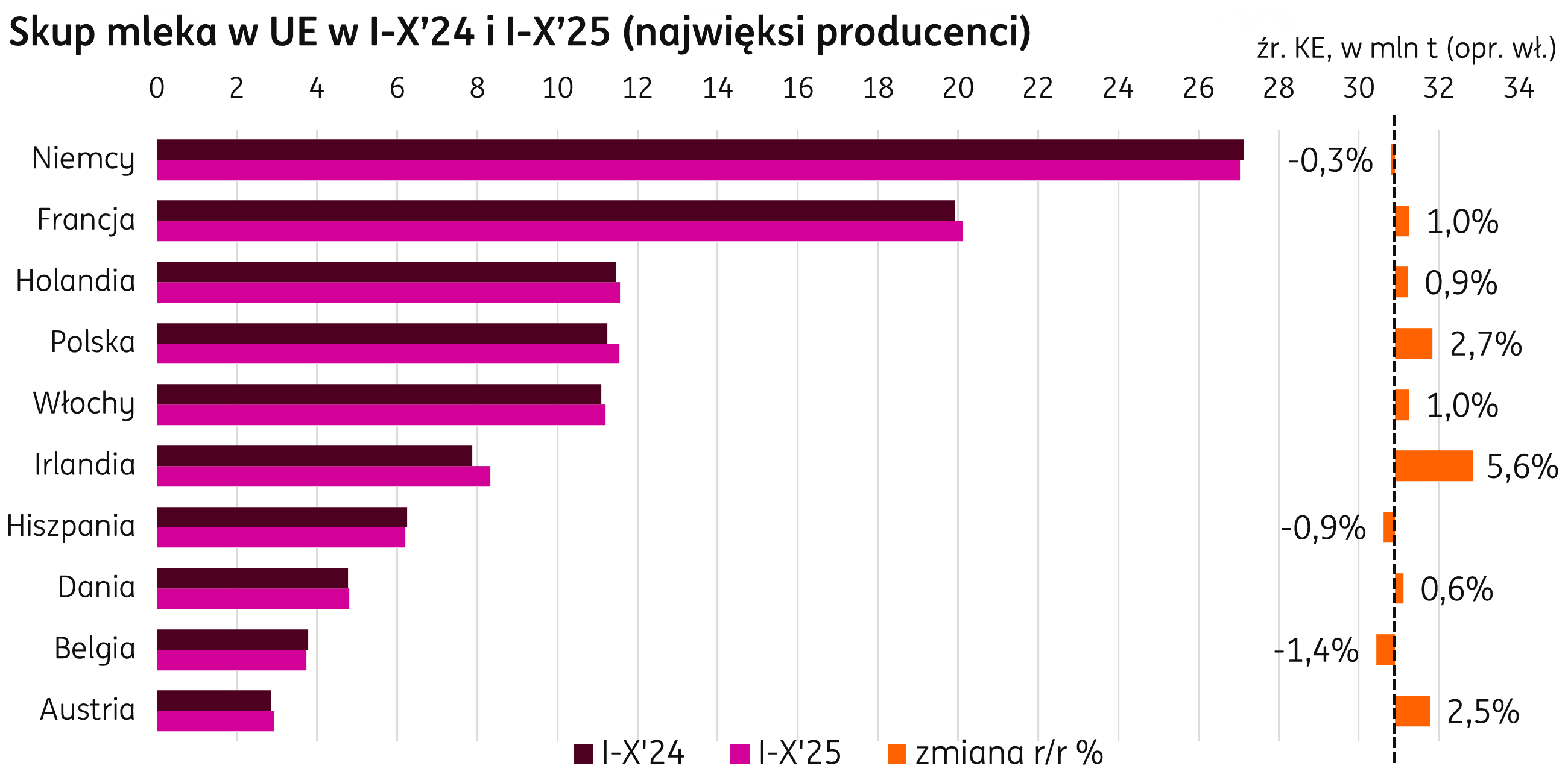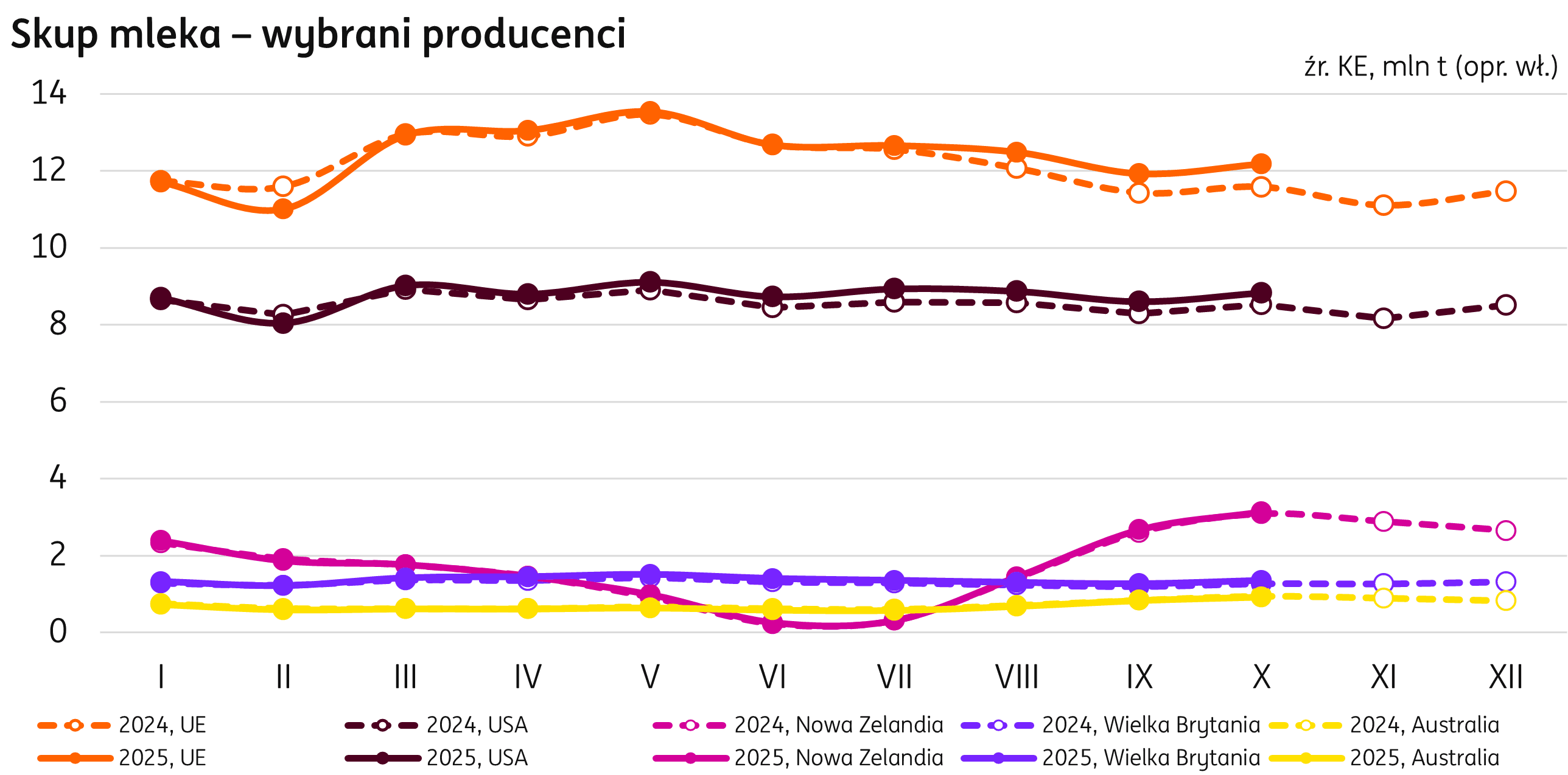 Produkcja mleka. W październiku skupiono w krajach Unii Europejskiej 12,2 mln t mleka, o 5% powyżej poziomu notowanego w październiku ubiegłego roku (dane zgodnie z publikacją KE). Narastająco od początku roku skup mleka w UE osiągnął wolumen 124,1 mln t (+1% r/r). W Niemczech utrzymuje się największy wolumenowo spadek (-92 tys. t r/r; -0,3% r/r) choć ostatnie trzy miesiące to spory wzrost, kompensujący spadki produkcji z pierwszej połowy roku. Produkcję zwiększono w Holandii (+105 tys. t, +1% r/r), również po słabszym początku 2025 r. Największy wzrost w analizowanym okresie osiągnęła Irlandia, o 0,4 mln t (+6% r/r), a skup mleka w Polsce powiększył się o 3% (+0,3 mln t r/r).
