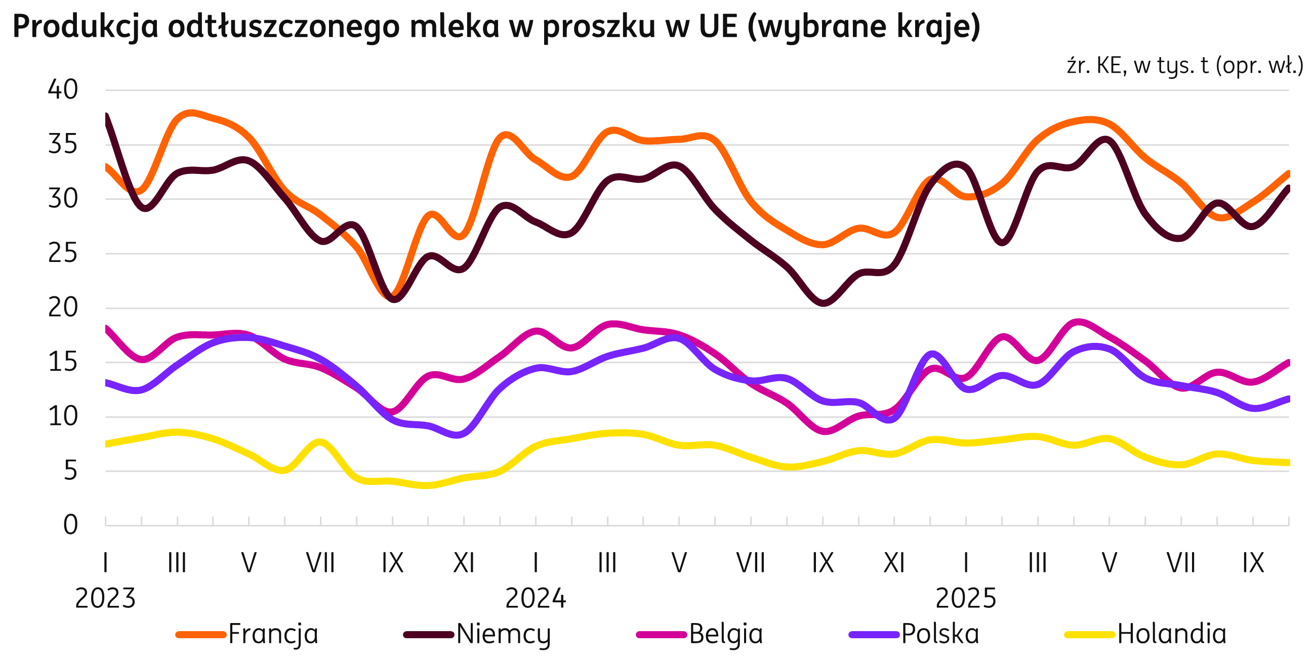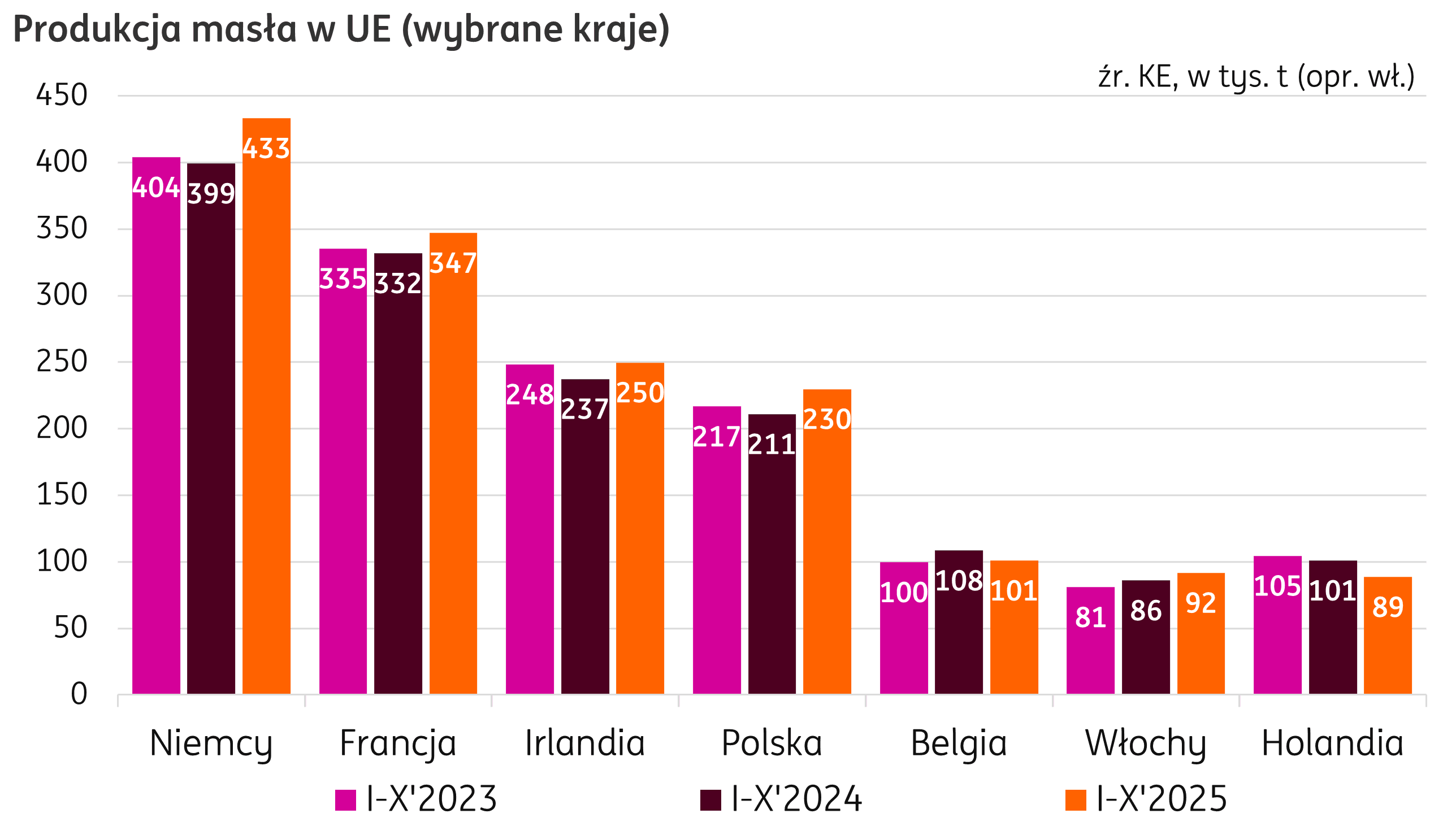 W miesiącach I-X 2025 r. kraje Unii Europejskiej wyprodukowały 1,8 mln t masła, o 5% powyżej produkcji ubiegłorocznej z analogicznego okresu (dane wg publikacji KE). Produkcję zwiększyły Niemcy (+34 tys. t r/r), Polska (+19 tys. t r/r), czy Francja (+15 tys. t r/r). Pozwala to skompensować spadki w krajach jak Holandia (-12 tys. t r/r) i Belgia (-8 tys. t r/r).