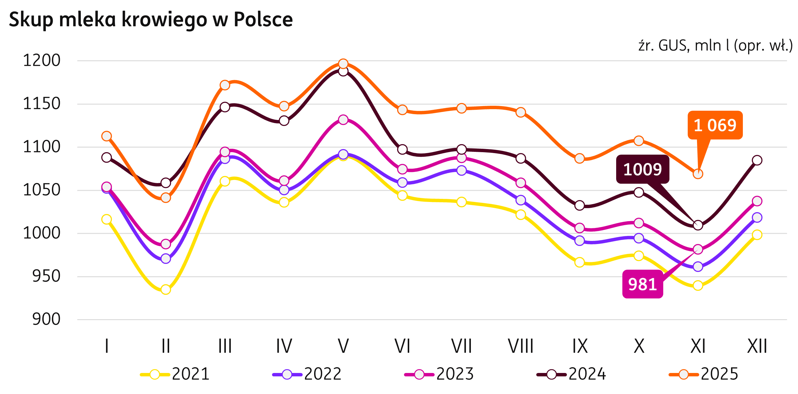 Produkcja mleka. Listopad 2025 r. to kontynuacja trendu wzrostowego w skupie mleka w Polsce, który osiągnął 1 069 mln l (dane wg Biuletynu Statystycznego GUS), o 6% powyżej produkcji z listopada ubiegłego roku (+60 mln l r/r). Po jedenastu miesiącach 2025 r. produkcja wzrosła do 12 389 mln l, to o 3% więcej w relacji rocznej (+370 mln l r/r).