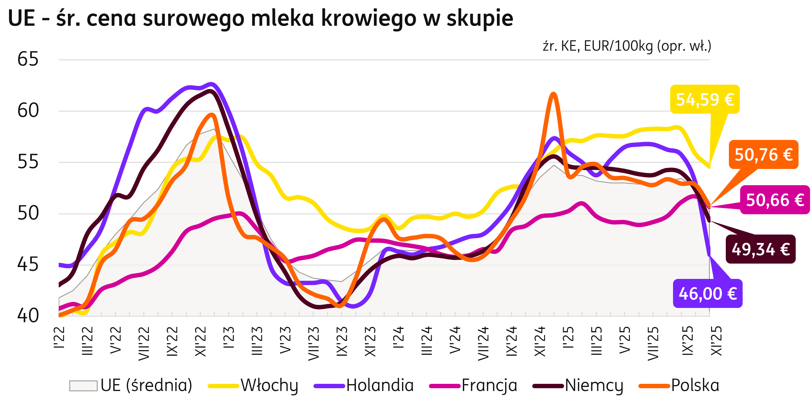 Ceny. Listopadowa średnia cena surowego mleka krowiego uzyskiwana w unijnych skupach to 50,28 EUR/100kg (publikacja KE). To spadek 4% w ciągu miesiąca i 6% poniżej poziomu ubiegłorocznego. Zgodnie z unijnymi danymi, średnia cena w Polsce to 50,76 EUR/kg, o 1% powyżej średniej unijnej.