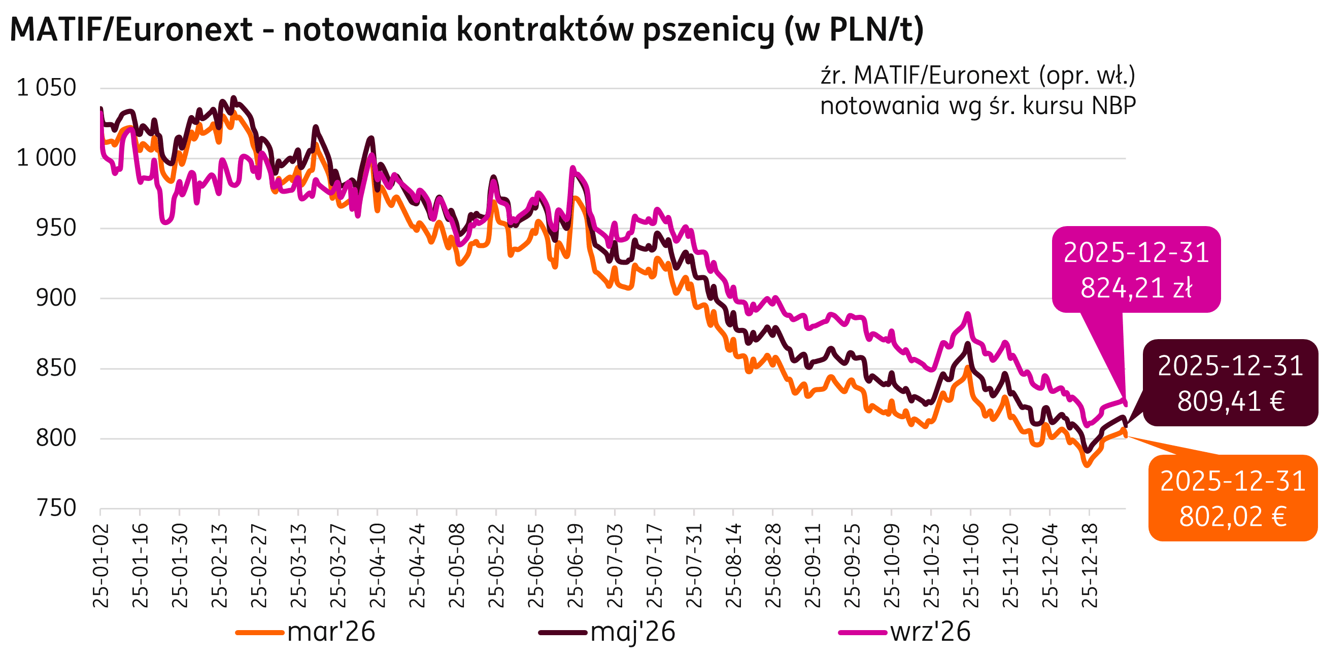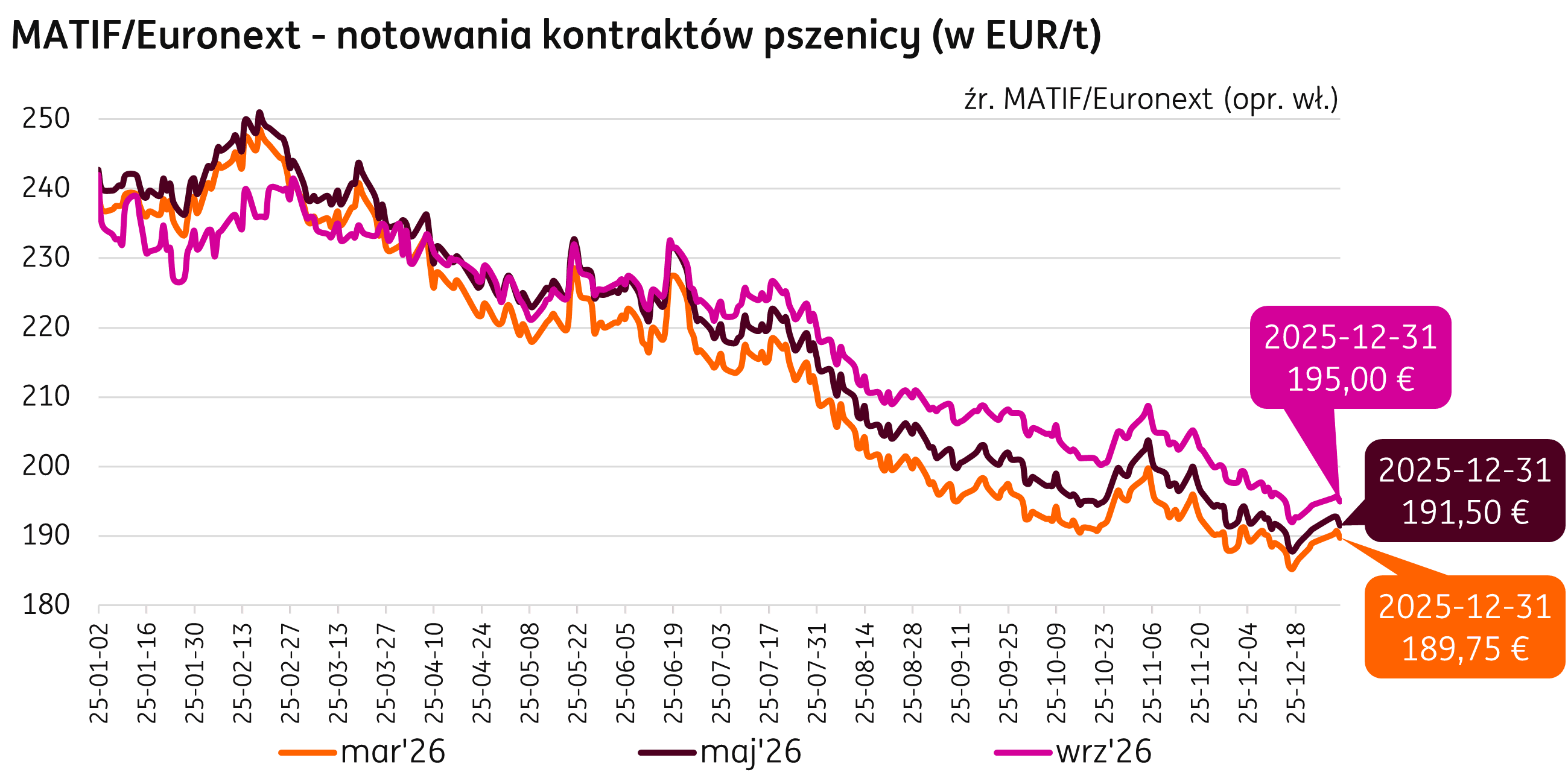 Rok 2025 kończył się notowaniami marcowego kontraktu pszenicy na giełdzie Euronext/MATIF na poziomie 189,75 EUR/t, to wzrost o 1,75 EUR/t w porównaniu do notowań z listopada (+0,9% m/m). Kontrakt majowy był 31 grudnia 2025 r. notowany na poziomie 191,50 EUR/t (0% m/m), natomiast wrześniowy na poziomie 195,00 EUR/t (-1,5% m/m).