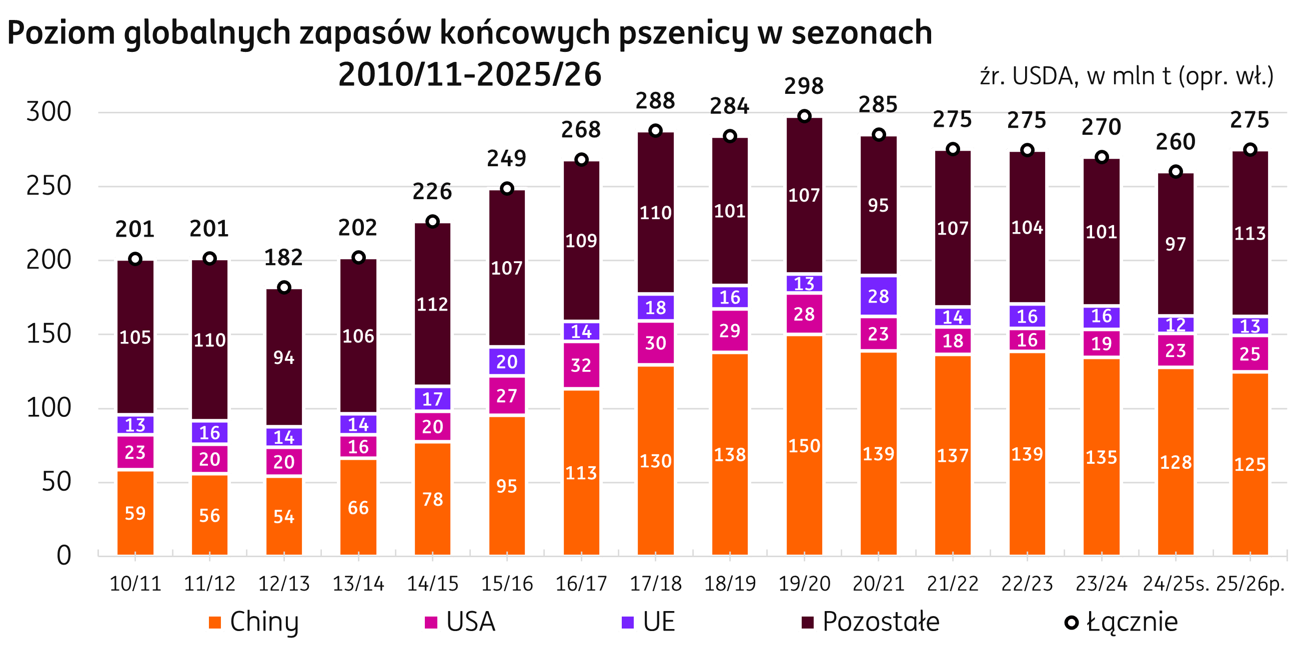 Świat. Grudniowe raporty USDA znacznie podniosły przewidywania dotyczące zapasów – mają być one na poziomie 274,9 mln t, o 14,8 mln t przewyższając zapasy z końca ubiegłego sezonu. Chiny mają zgromadzić 124,8 mln t tego zboża, o 3,0 mln t mniej w porównaniu rocznym. Drugą pozycję zachowają Stany Zjednoczone z zapasami 24,5 mln t (+6% r/r), natomiast Indie pod koniec tego sezonu mają zgromadzić 17,2 mln t pszenicy (+5,4 mln t r/r, +46% r/r), wyprzedzając UE z zapasami 13,7 mln t (+2,0 mln t r/r).