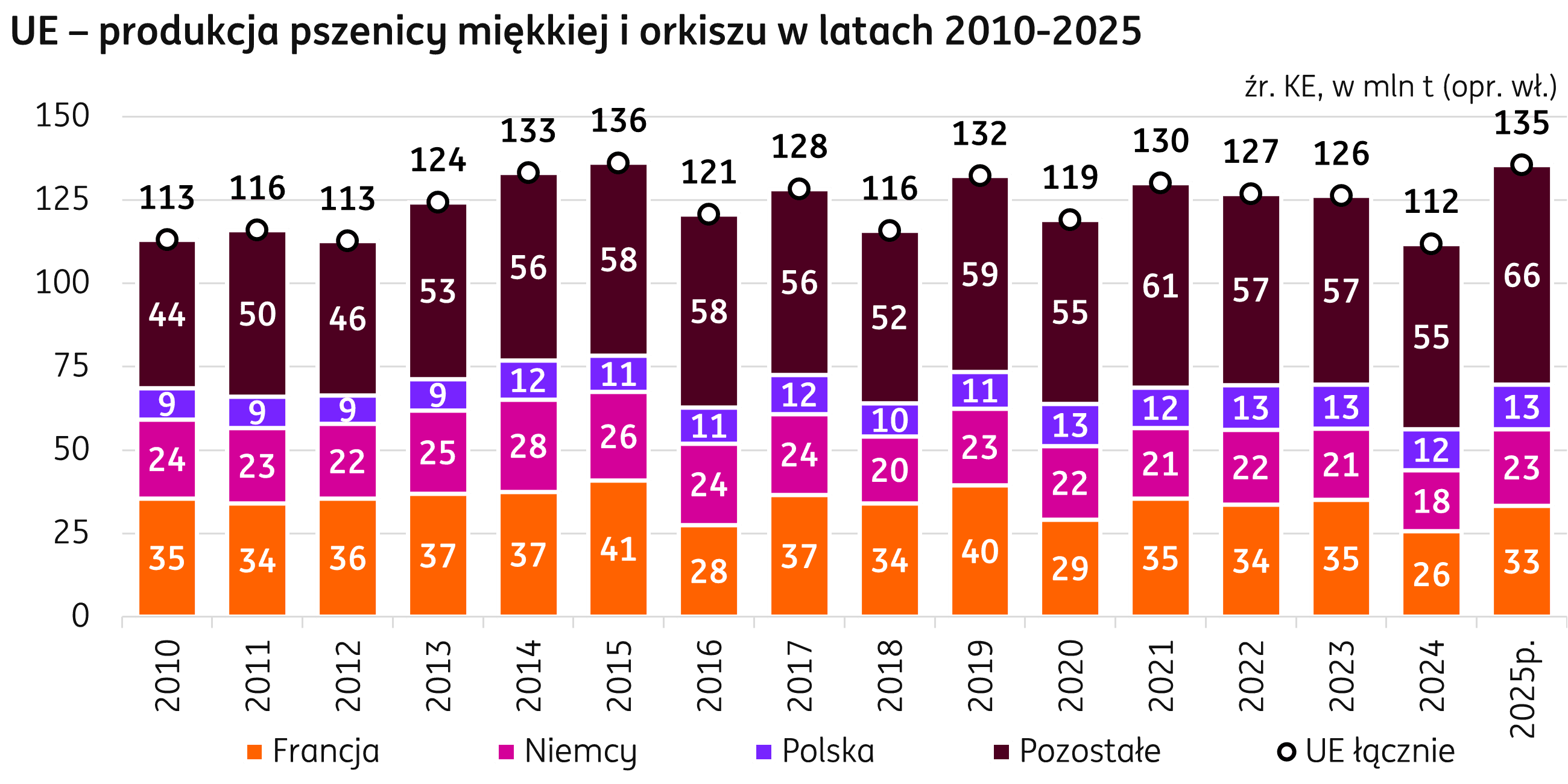 Unia Europejska. Grudniowa edycja raportów Komisji Europejskiej niesie za sobą kolejne podwyższenie prognoz produkcji pszenicy w bieżącym sezonie - jej zbiory są już szacowane na poziomie 135,4 mln t, o 23,6 mln t powyżej wolumenu z ubiegłego sezonu (+21% r/r) i najwyższy wynik od 2015 r. Zbiory pszenicy u największych producentów są szacowane na następujących poziomach: we Francji 33,3 mln t (+30% r/r), w Niemczech 23,0 mln t (+26% r/r), a w Polsce 13,4 mln t (+3% r/r).