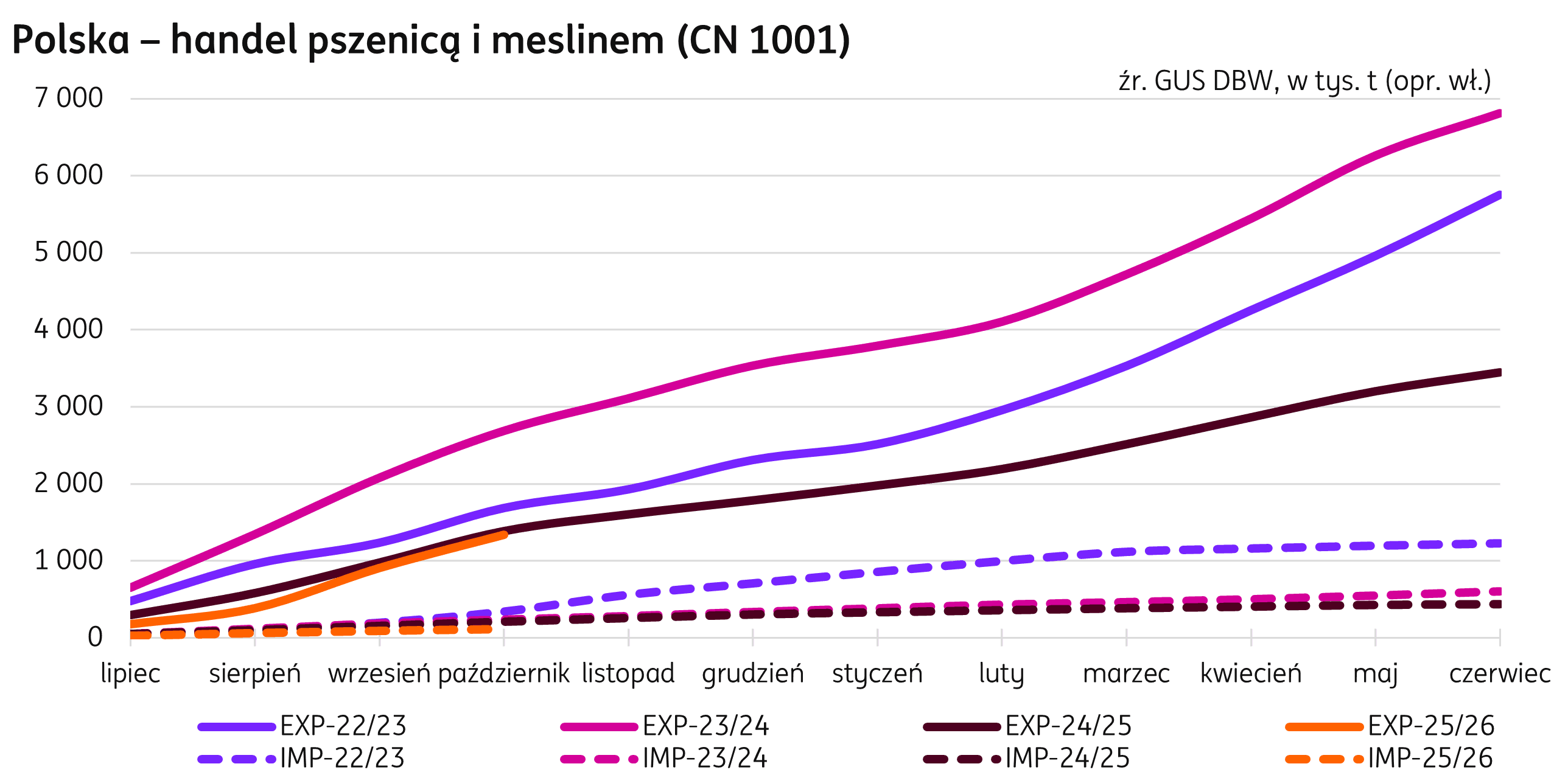 Handel. Eksport pszenicy z Polski po czterech miesiącach 2025/26 jest na poziomie 1 338 tys. t, o 3% poniżej wyniku notowanego w analogicznym okresie ubiegłego sezonu (-48 tys. t r/r). Eksport z października był o 5% r/r wyższy, kształtując się w wolumenie 430 tys. t. Import pozostaje na obniżonym poziomie, w analizowanym okresie osiągnął 114 tys. t, o 46% niżej niż przed rokiem, a tylko w październiku dostawy pszenicy do Polski osiągnęły 22 tys. t (-59% r/r).