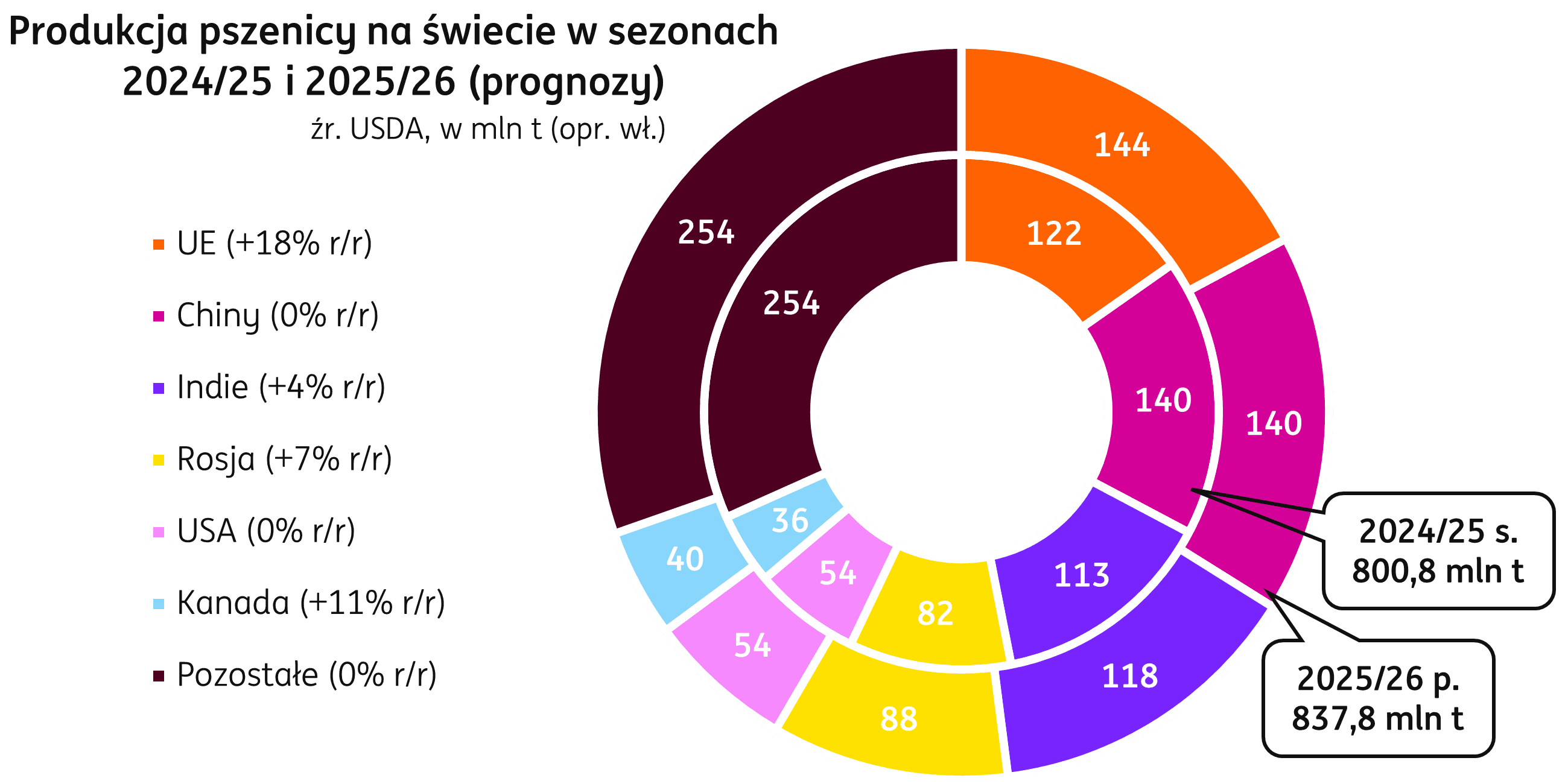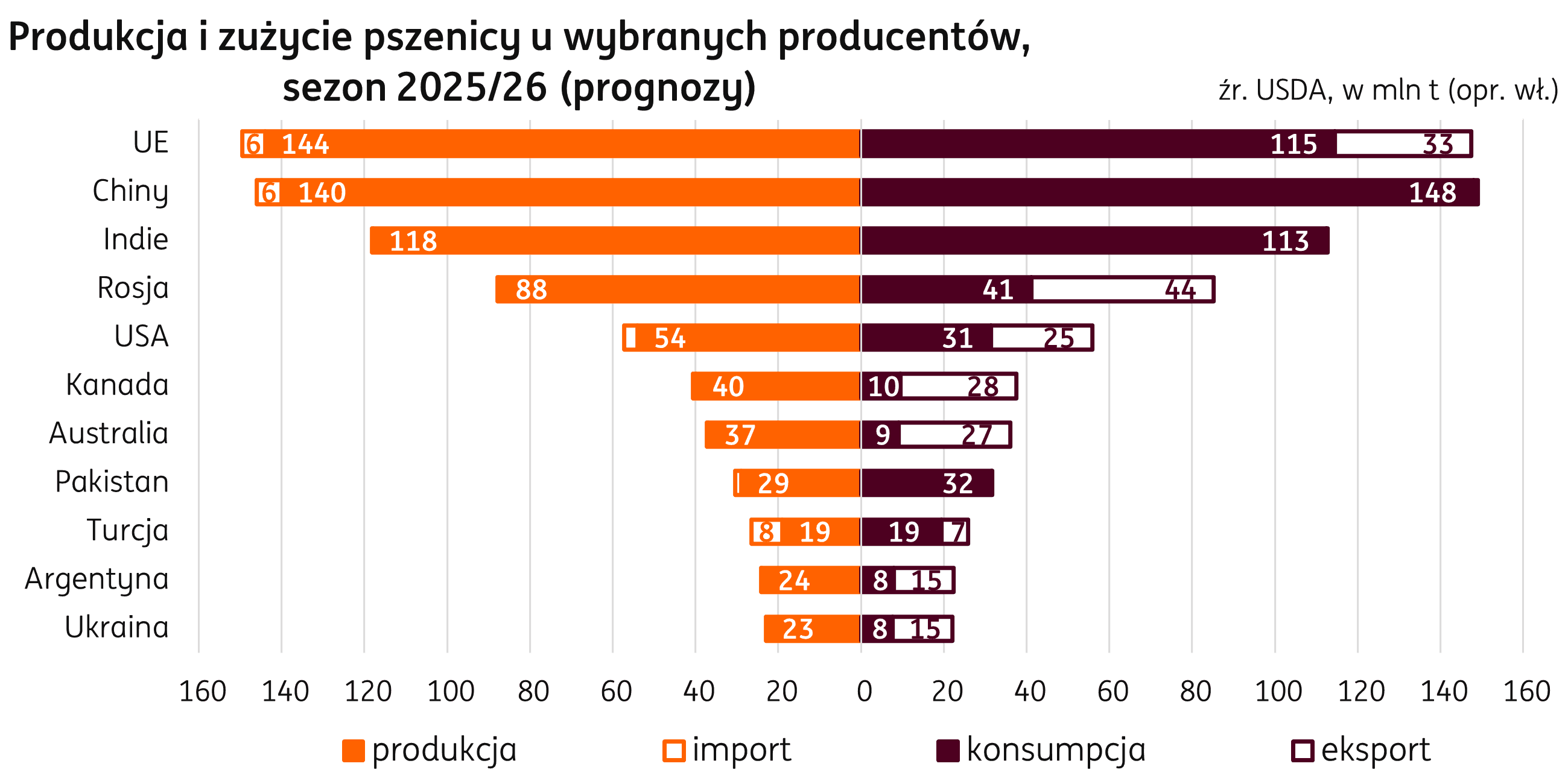 Świat. Globalna produkcja pszenicy w sezonie 2025/26 została przez Departament Rolnictwa Stanów Zjednoczonych (USDA) podniesiona w grudniowej edycji raportów do 837,8 mln t. To o 21,6 mln powyżej prognoz z września (przed procedurą zamknięcia rządu (government shutdown) w Stanach Zjednoczonych. W relacji do poprzedniego sezonu, zbiory mają być wyższe o 37,0 mln (+4,6% r/r). Największy udział w globalnej produkcji tego zboża mają kraje Unii Europejskiej ze zbiorami 144 mln t (+18% r/r), kolejne są Chiny i 140 mln t (-0,1% r/r) oraz Indie i produkcja 118 mln t (+4% r/r). Powyżsi producenci odpowiadają za 48% zbiorów pszenicy w sezonie 2025/26. Trwają żniwa na półkuli południowej, a ze spływających danych wynika, że zbiory są na bardzo dobrym poziomie – szczególnie w Australii, której produkcja pszenicy jest szacowana na 37 mln t (+2,9 mln t r/r) oraz w Argentynie, która notuje zbiory 24 mln t (+5,5 mln t r/r).