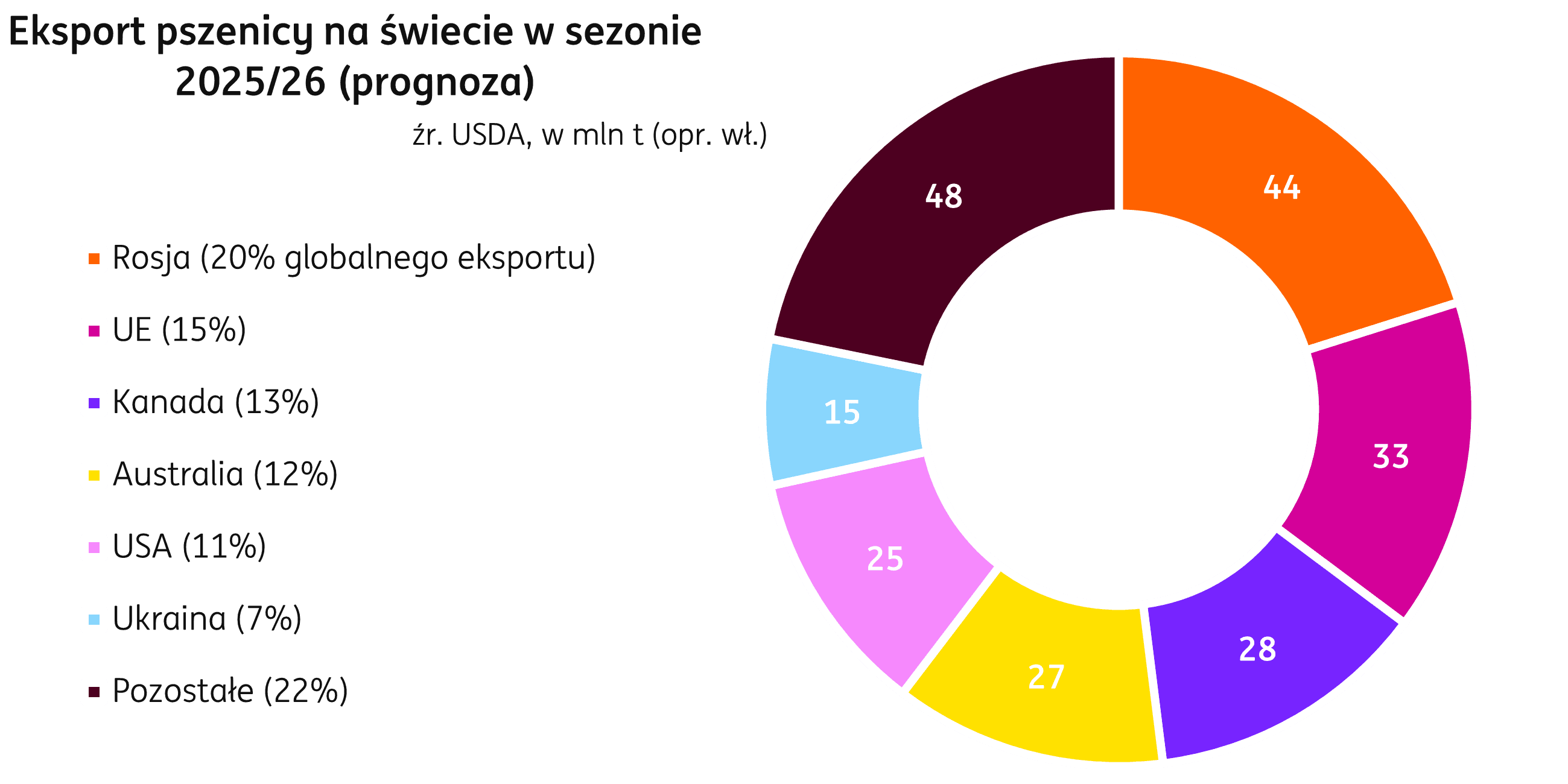 Świat. W zrewidowanych w grudniu raportach USDA poziom globalnego handlu pszenicą w sezonie 2025/26 jest prognozowany na 218,7 mln t, o 14,2 mln t powyżej ubiegłego sezonu. Rosja utrzymuje pozycję lidera w globalnym eksporcie pszenicy w tym sezonie z prognozowanym wolumenem 44 mln t, co oznacza wzrost o 1 mln t r/r. Poniżej plasuje się eksport 33 mln t pszenicy z krajów Unii Europejskiej przekraczający o 18% poziom ubiegłoroczny (+5 mln t r/r). Największym importerem pozostaje Egipt, dostawy do tego kraju są prognozowane na poziomie 13 mln t (+5% r/r). Na kolejnych pozycjach są Indonezja: 12,5 mln t (+20% r/r) i Algieria: 9,5 mln t (+4% r/r).