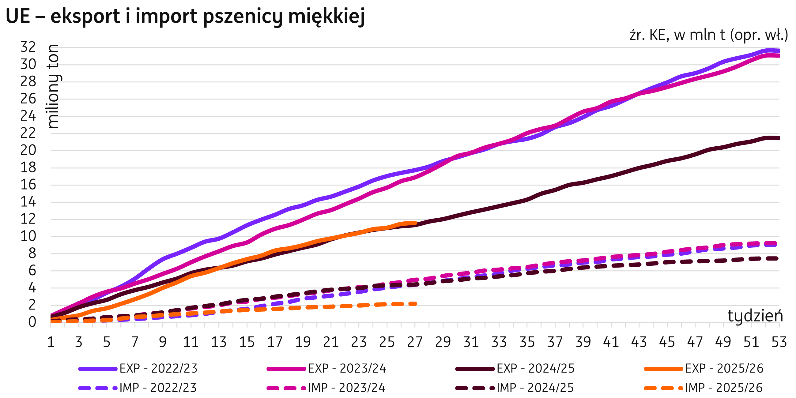 Unia Europejska. Opublikowane przez KE po upływie połowy sezonu 2025/26 wstępne dane wskazują, że eksport pszenicy z krajów UE kształtuje na wyższym o 2% poziomie od wolumenu notowanego w tym okresie sezonu 2024/25 (+256 tys. t r/r). Głównym odbiorcą europejskiej pszenicy w analizowanym okresie była Maroko. Import pszenicy po 27 tygodniach (01.07.-30.12.2025) był niższy o 54% (-2,3 mln t r/r) od ubiegłorocznego z tego okresu, osiągając poziom 2,2 mln t, a największym jej dostawcą do UE była Kanada.
