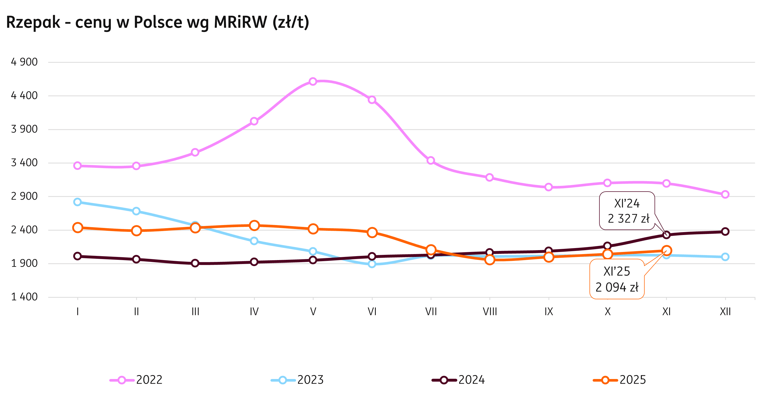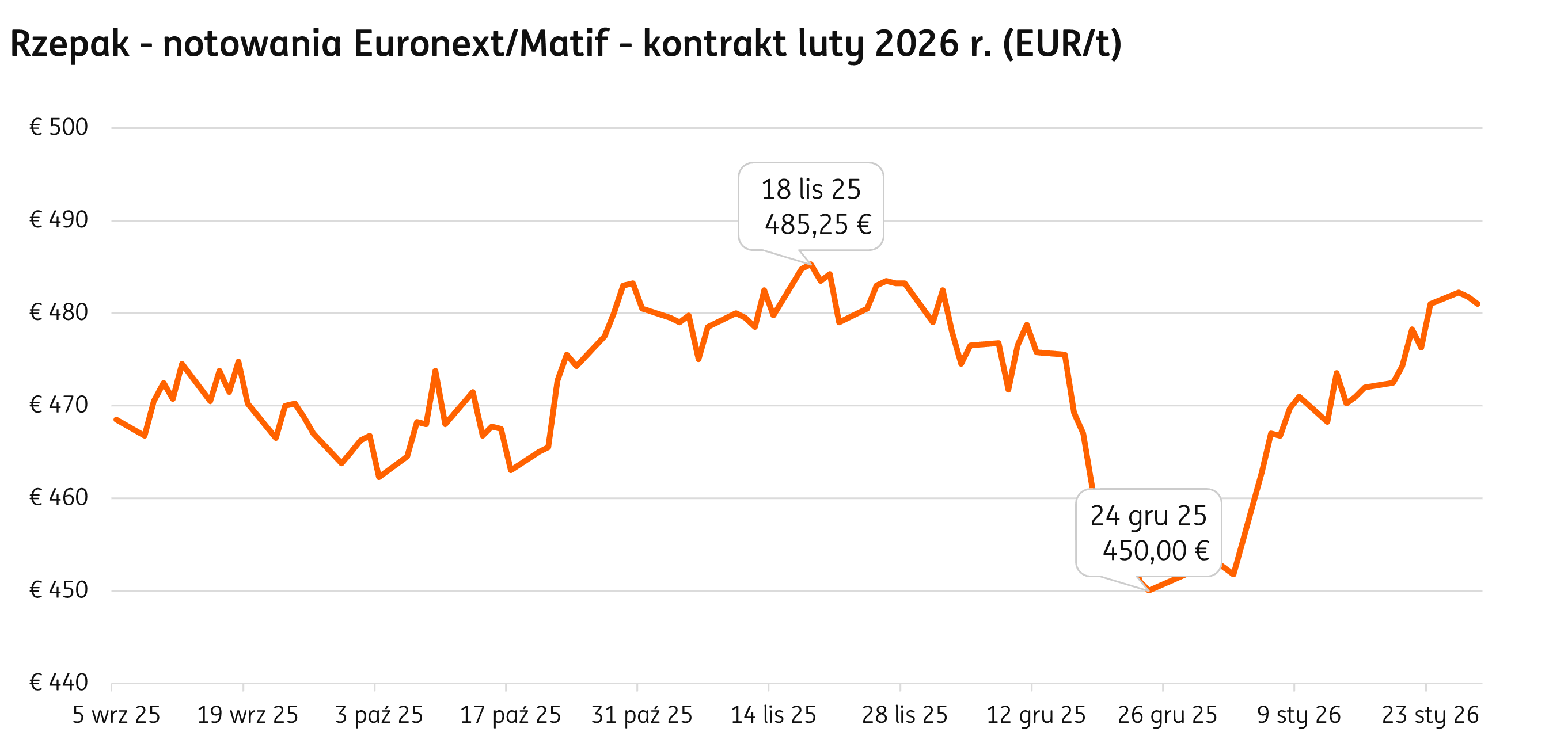 W tygodniu kończącym się 25 stycznia 2026 r. średnie stawki za rzepak wyniosły 2119 zł/t zgodnie z danymi MRiRW. W porównaniu z wcześniejszym tygodniem cena nieznacznie zwiększyła się. W stosunku do zeszłego roku bieżące ceny są o 13% niższe (325 zł.
