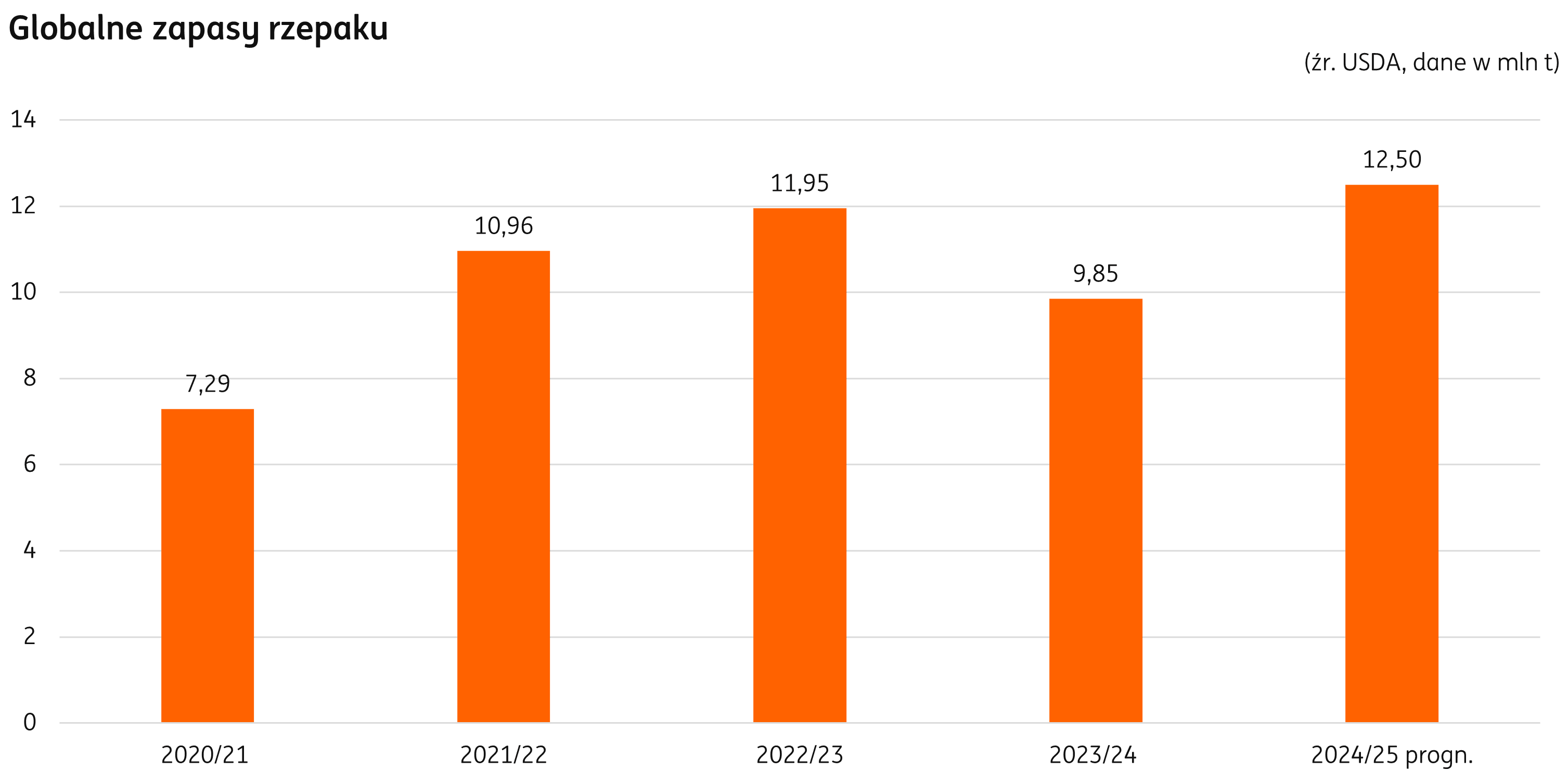 Grudniowy raport przyniósł kolejną podwyżkę szacunków USDA dotyczących zapasów końcowych. Kanada mimo wcześniejszego podwojenia wolumenu do 3 mln t, także i w ostatniej aktualizacji wyróżniła się wzrostem zapasów o kolejne 0,7 mln t do 3,7 mln t.