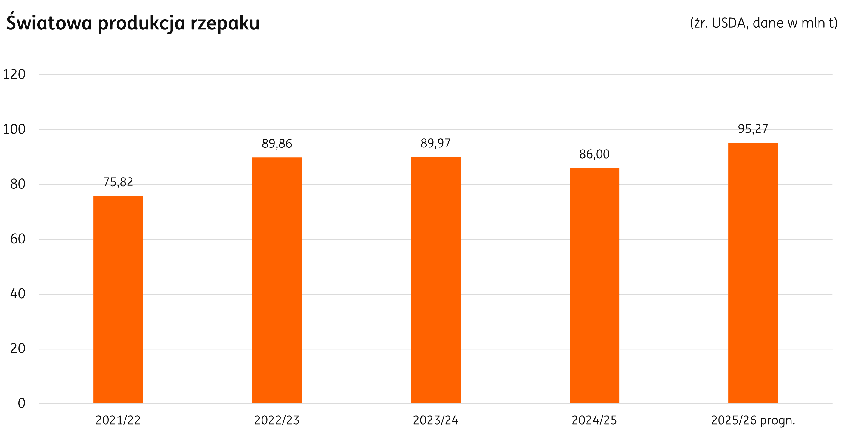 Świat: Grudniowa aktualizacja prognoz USDA (Departament Rolnictwa USA) charakteryzowała się wzrostem prognoz globalnej produkcji. Jest ona o ponad 3% wyższa m/m. Złożyła się na to głównie 10proc. podwyżka w Kanadzie (z 20 do 22 mln t) w stosunku do wcześniejszych szacunków. Także w Australii, dużego globalnego eksportera, wolumen zbiorów wzrósł (o 0,5 mln t do 7,2 mln t). Globalna produkcja w bieżącym sezonie jest o blisko 11% wyższa niż w okresie 2024/25.