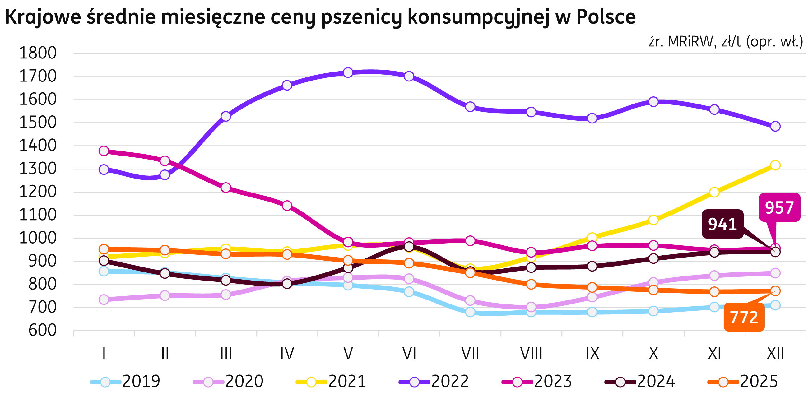 Cena. Grudniowa średnia cena pszenicy konsumpcyjnej w Polsce, według Biuletynu MRIRW, notuje pierwszy od stycznia wzrost w 2025 r. i sięga 772 zł/t (+0,5% r/r). W relacji rocznej, grudzień zakończył się spadkiem cen o 18% (-169 zł/t r/r). Na rynku krajowym w tygodniu kończącym się 25 stycznia 2026 r. średnie ceny pszenicy konsumpcyjnej kształtowały się w przedziale 698-807 zł/t.