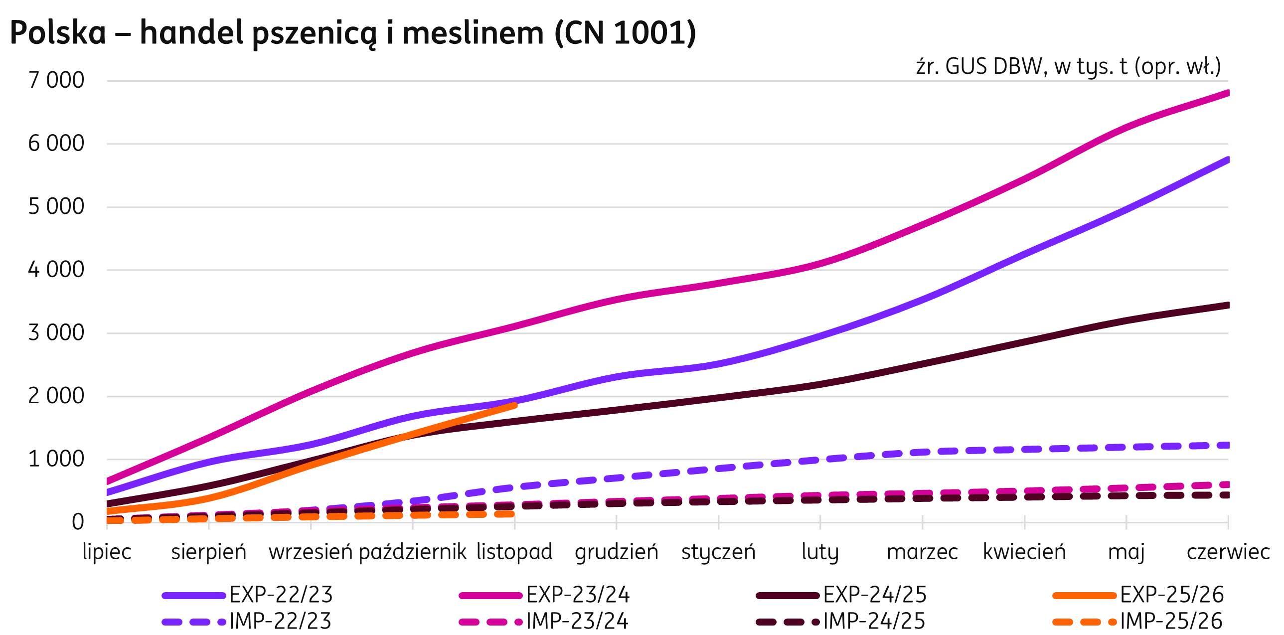 Handel. Pięć miesięcy sezonu 2025/26 zakończyło się eksportem pszenicy na poziomie 1 857 tys. t (dane zgodnie z portalem GUS Dziedzinowe Bazy Wiedzy), to wzrost o 16% w relacji rocznej. Tylko w listopadzie zanotowano eksport 458 tys. t, o 110% więcej niż przed rokiem. Import od początku sezonu w porównaniu do ubiegłorocznego spadł już prawie o połowę, w miesiącach VII-XI 2025 r. zanotowano 136 tys. t (-48% r/r), a tylko w listopadzie osiągnął 20 tys. t (-58% r/r).