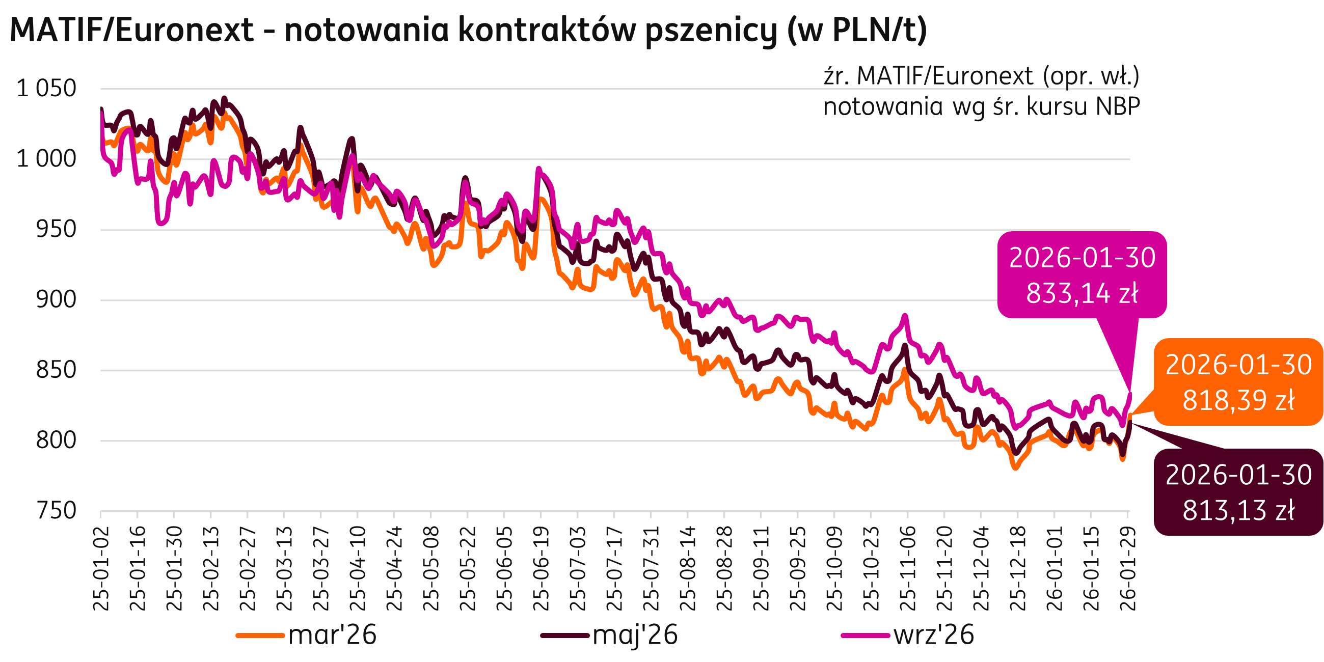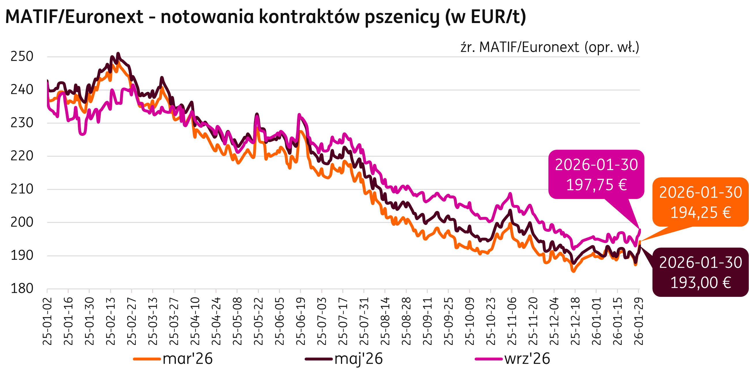 Pierwszy miesiąc 2026 r. upłynął pod znakiem nieznacznych wahań notowań pszenicy na giełdzie Euronext / Matif. Cena kontraktu marcowego była 30 stycznia 2026 r. na poziomie 194,25 EUR/t, to wzrost o 3,50 EUR/t w porównaniu do notowań z grudnia (+1,8% m/m). Kontrakt majowy był w tym dniu notowany na poziomie 193,00 EUR/t (+0,1% m/m), natomiast wrześniowy na poziomie 197,75 EUR/t (+1,0% m/m).