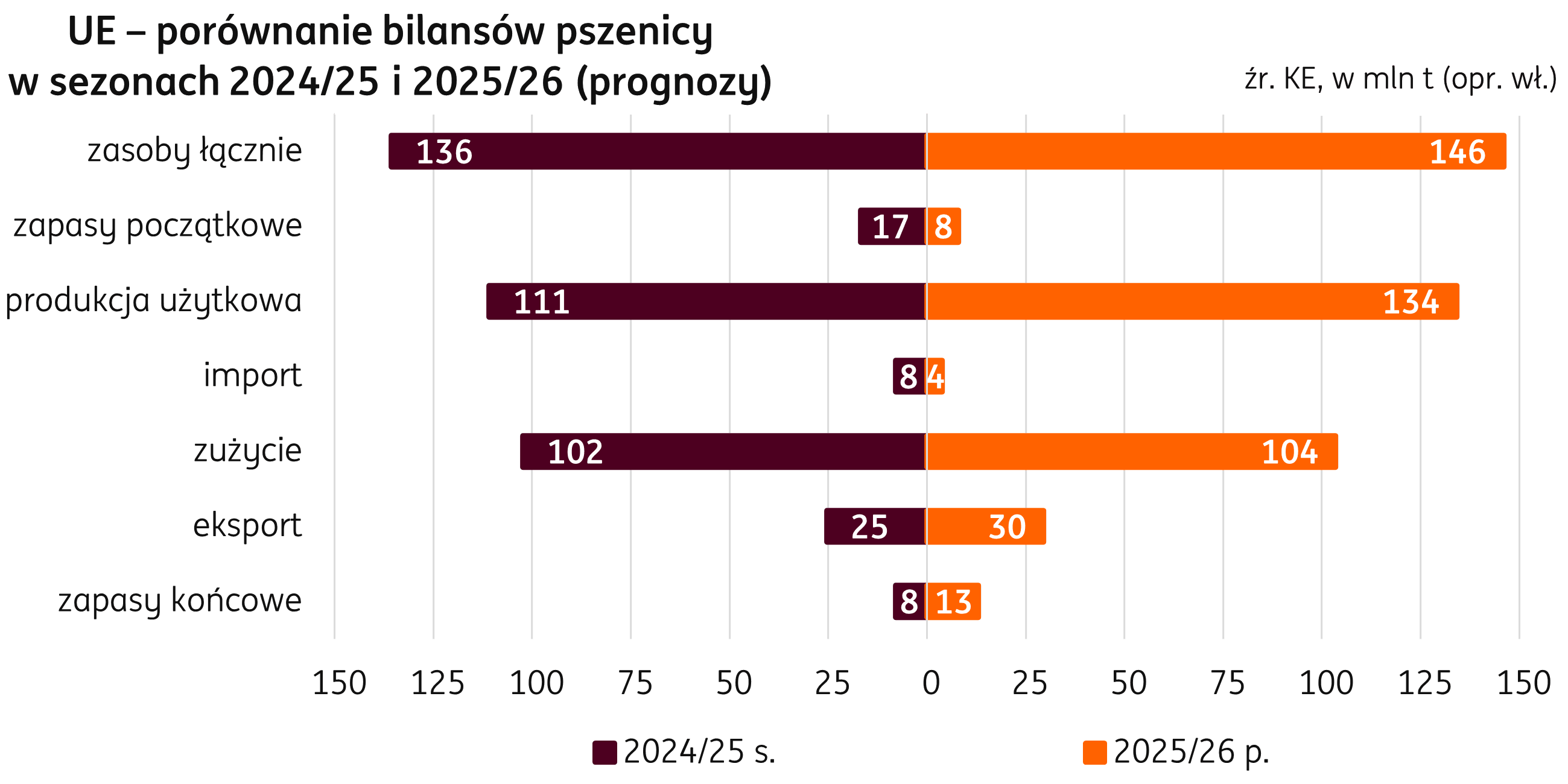 Unia Europejska. Po upływie siedmiu miesięcy sezonu 2025/26 eksport pszenicy z krajów Unii Europejskiej osiąga wstępnie poziom 12,8 mln t, minimalnie powyżej ubiegłorocznego (+215 t r/r; wstępne dane opublikowane przez KE). Dwa główne kierunki w tym okresie to Maroko (2,3 mln t, +64% r/r), Arabia Saudyjska (1,0 mln t, +87% r/r) i Egipt (1,0 mln t, +8% r/r). Poziom importu spadł, osiągając po 31 tygodniach tego sezonu 2,4 mln t i zmniejszając się o 54% r/r (-2,8 mln t r/r). 39% importowanej w tym okresie pszenicy pochodziło z Kanady (0,9 mln t; +32% r/r), a 22% z Ukrainy (0,5 mln t, -85% r/r).