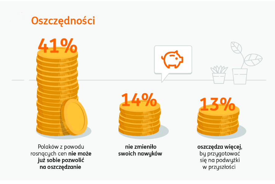 Zgodnie z raportem ING Consumer Survey aż 41% Polaków nie może już sobie pozwolić na oszczędzanie. 14% nie zmieniło swoich przyzwyczajeń, a 13% próbuje oszczędzać więcej, by lepiej przygotować się na podwyżki w przyszłości.